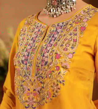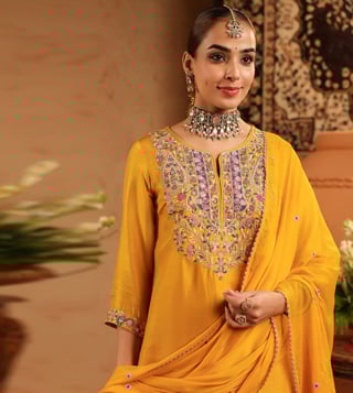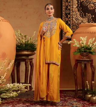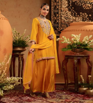 Crafted in rich Russian silk, this fuchsia sharara set is a graceful blend of traditional artistry and modern elegance. The straight kurta features intricate multicoloured thread, zari dori and sequin embroidery on the yoke, and sleeve borders - beautifully enhanced with hand-applied beadwork for a subtle festive charm. Tailored with a sweetheart neckline, 3/4th sleeves, and side slits for ease, the kurta is lined with soft cotton voile for breathable, all-day comfort. It is paired with solid shantoon sharara and a light chiffon dupatta, finished with delicate embroidery.
