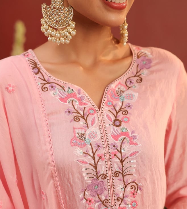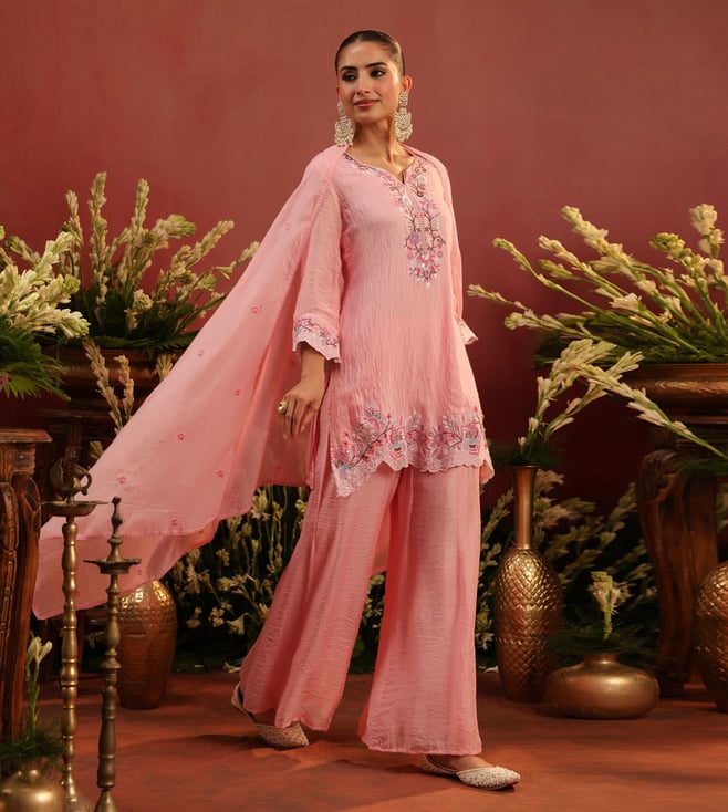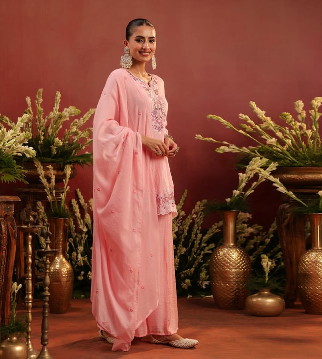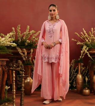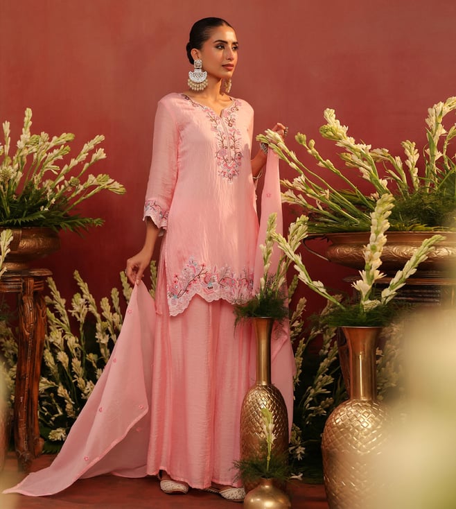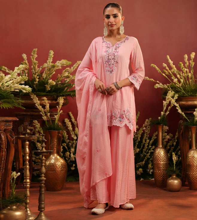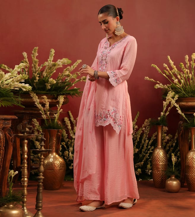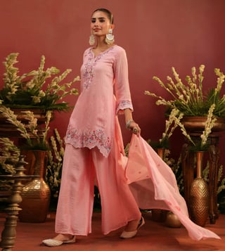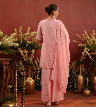 A beautiful fusion of tradition and elegance, this pink sharara set is crafted in luxurious mul chanderi. The straight kurta is adorned with intricate multicoloured embroidery on the yoke, sleeve edges, and hem, featuring delicate scalloped embroidery detailing at the bottom for a graceful finish. Designed with a flattering sweetheart neckline, 3/4th sleeves, and side slits, the kurta is lined with soft cotton voile for breathable comfort throughout the day. It is paired with a matching mul chanderi sharara and a coordinated dupatta embellished with floral embroidery motifs and lace borders.