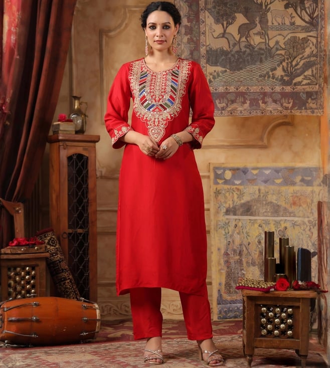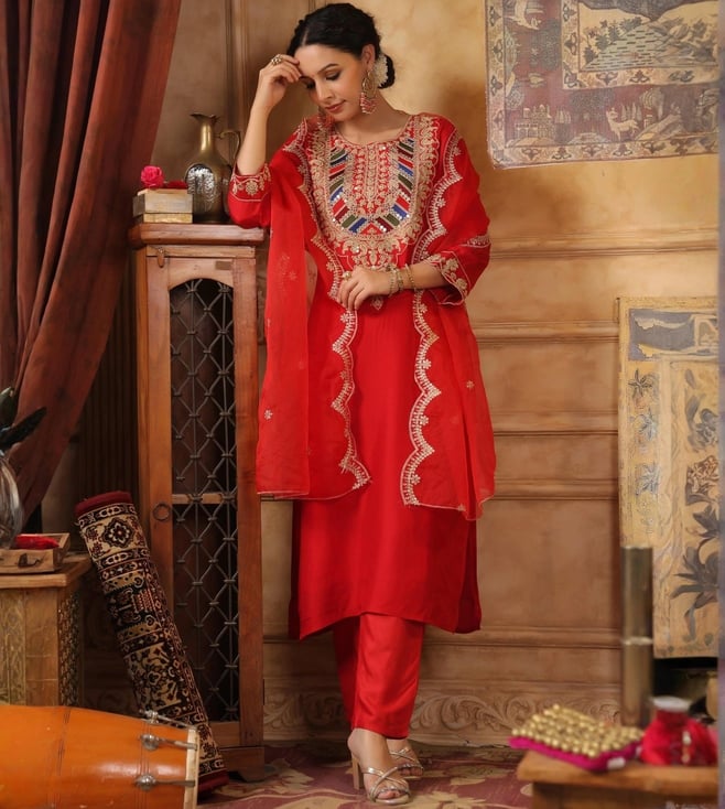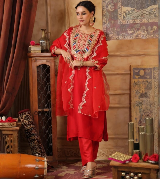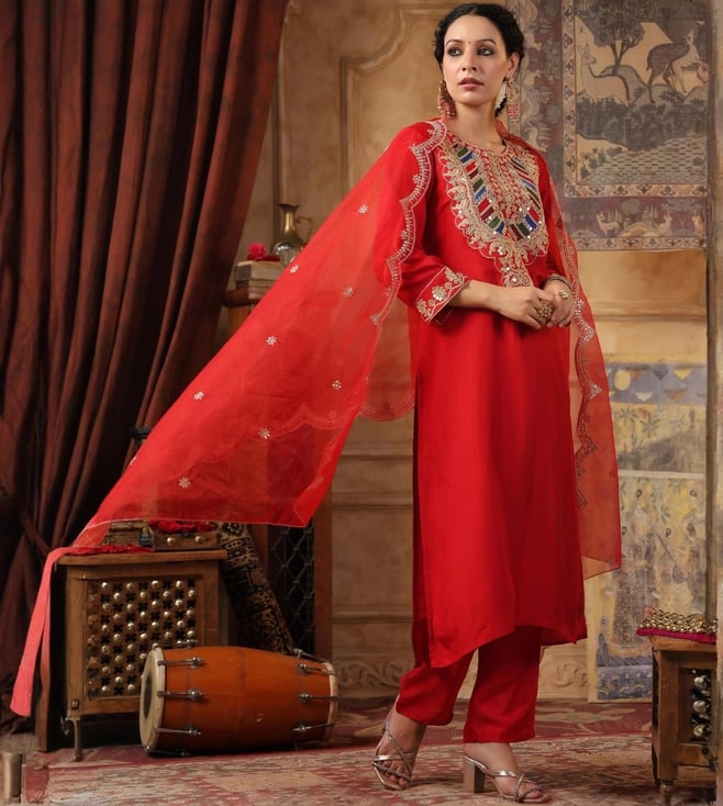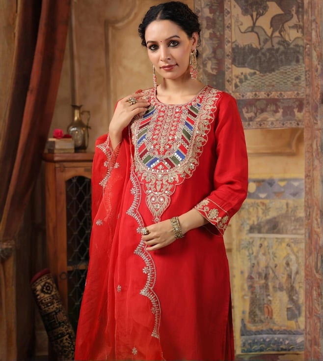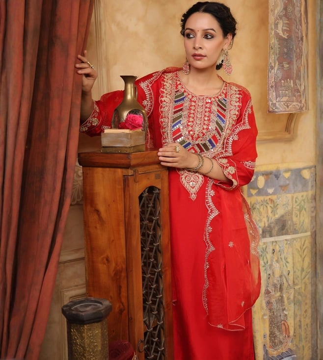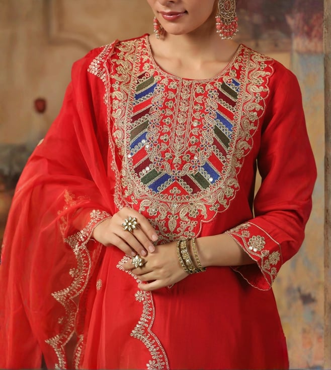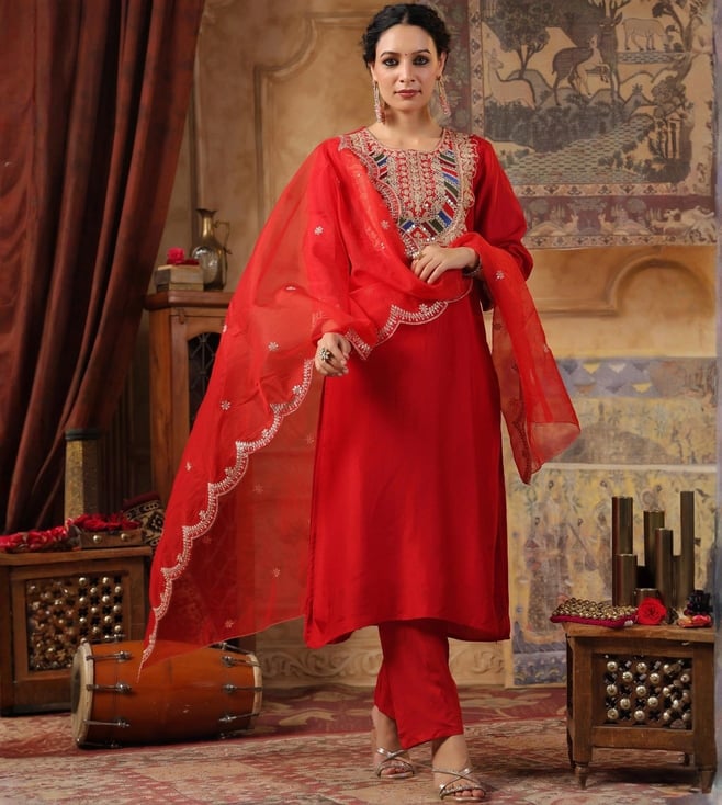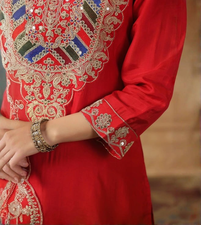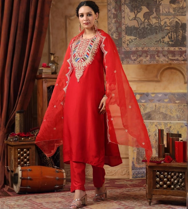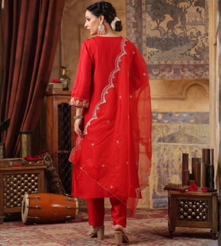 SCAKHI QALA Red Dupion Silk Dori & Sequin Work Suit Set