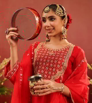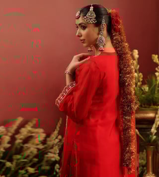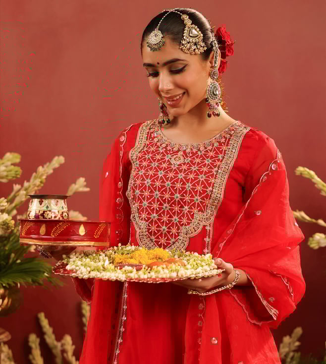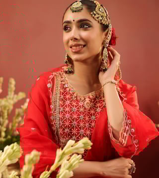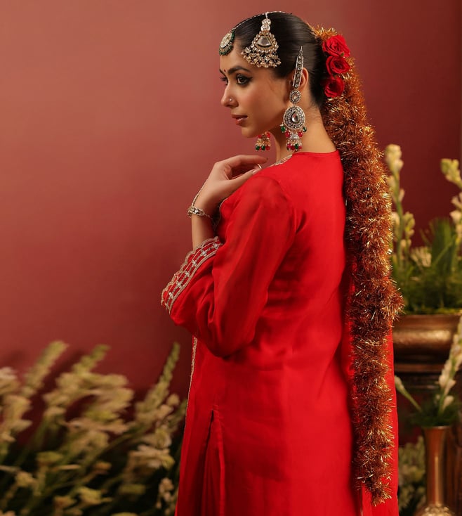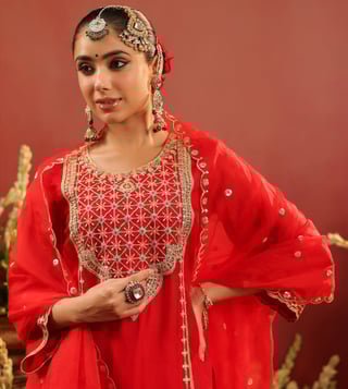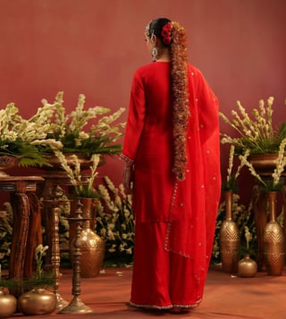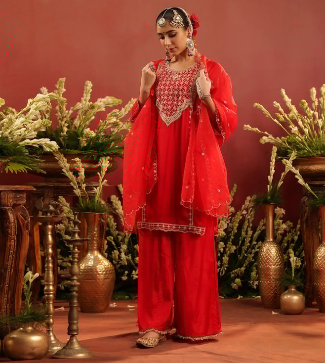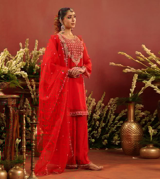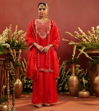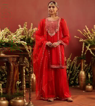 Crafted in rich organza silk, this red sharara set blends traditional artistry with graceful elegance. The straight kurta is adorned with intricate zari dori embroidery on the yoke, front panel, sleeve edges, and hem - accentuated with contrast thread highlights for added depth. Delicate scalloped detailing along the sleeves and kurta hem lends a refined finish. Designed with a round neckline, 3/4th sleeves, and side slits, the kurta is lined with soft cotton voile for breathable all-day comfort. It is paired with a matching shantoon sharara and a soft organza silk dupatta.