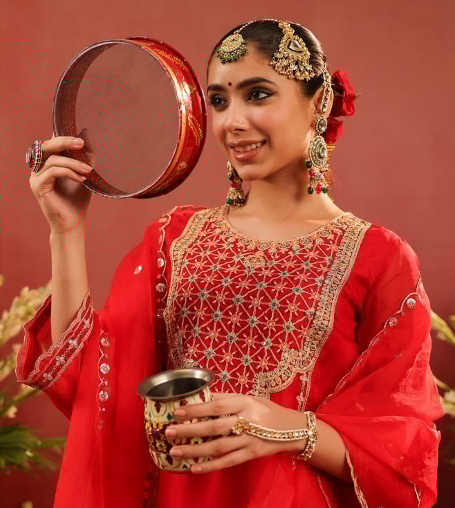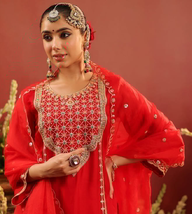 SCAKHI Red Organza Regular Fit Suit Set