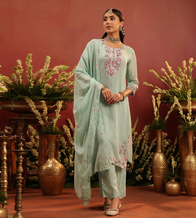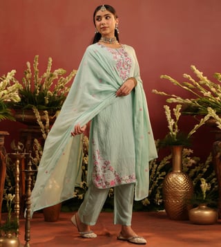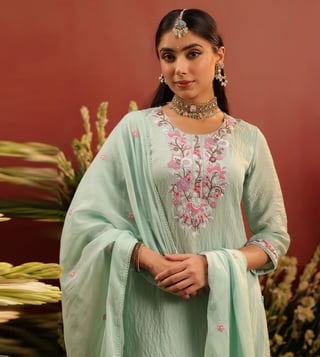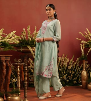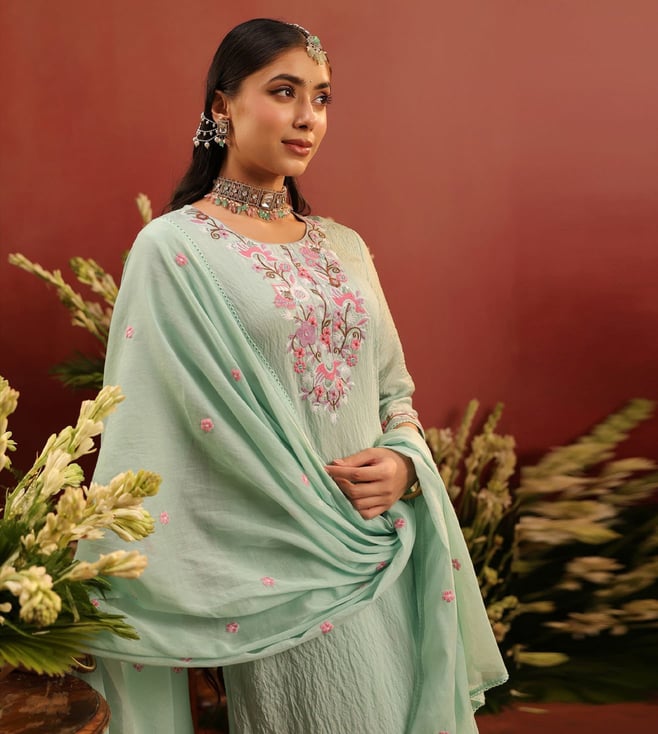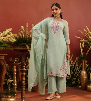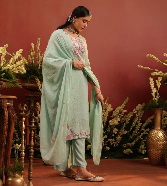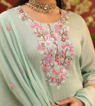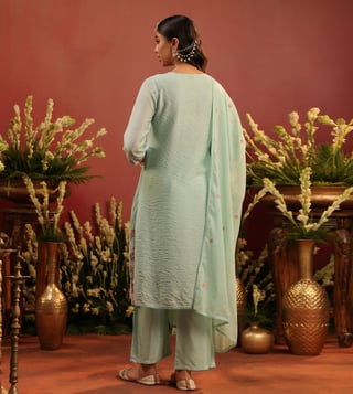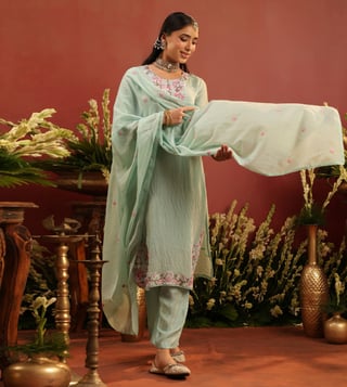 A graceful blend of tradition and charm, this sea green straight suit set is crafted from luxurious mul chanderi. The kurta is adorned with intricate multicolour embroidery on the yoke, sleeve edges, and bottom hem, adding a vibrant yet elegant touch. Designed with a classic round neckline, 3/4th sleeves, and side slits for ease of movement, the kurta is lined with soft cotton voile for all-day comfort. It is paired with matching solid shantoon pants and a coordinated mul-chanderi dupatta, delicately embellished with floral embroidery motifs and lace detailing.