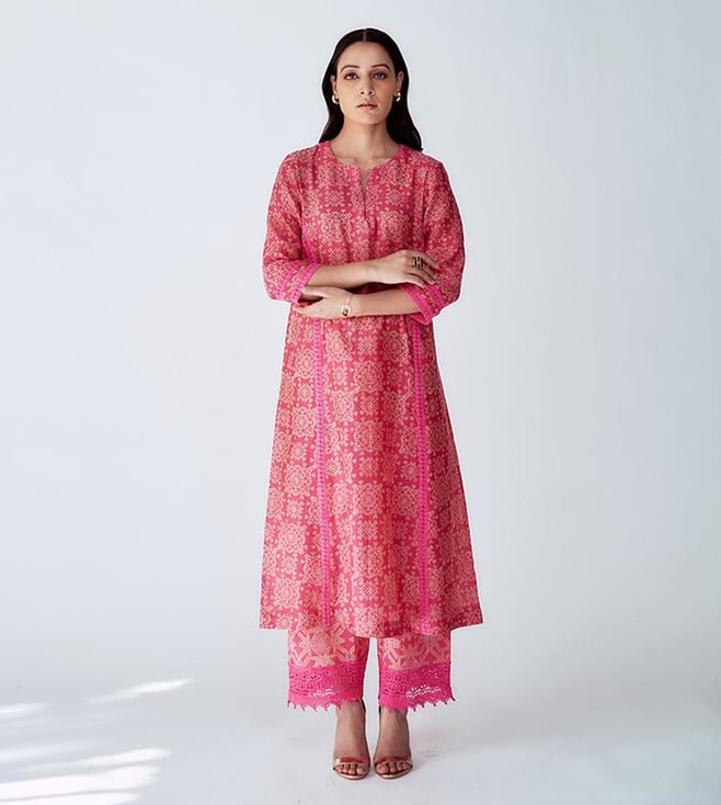 Hot Pink Mogra Safina Appliue Kurta with Trouser and Scarf
