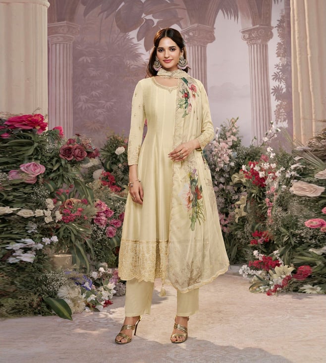 Off White Embroidered Regular Fit Anarkali Suit Set
