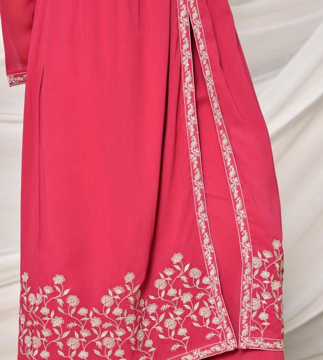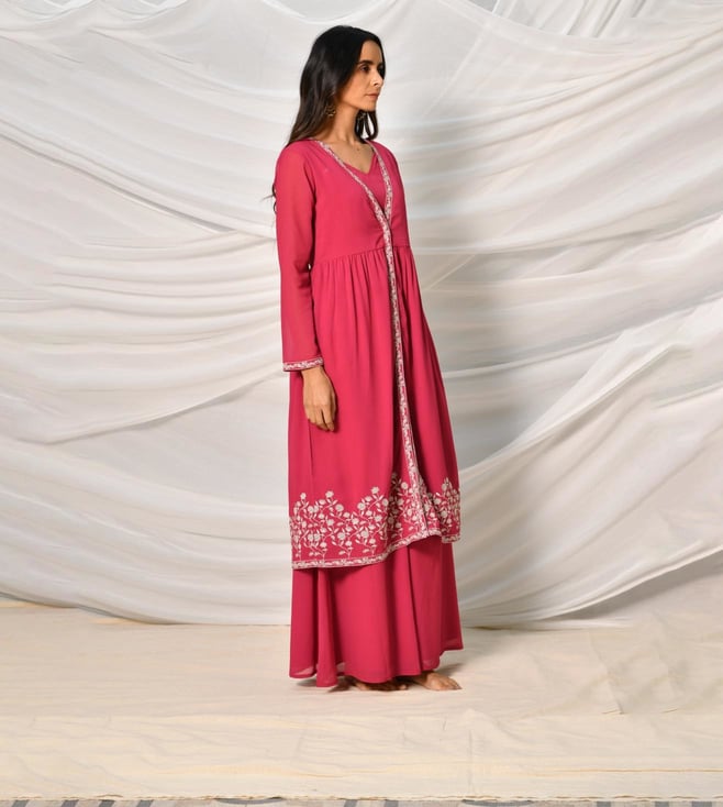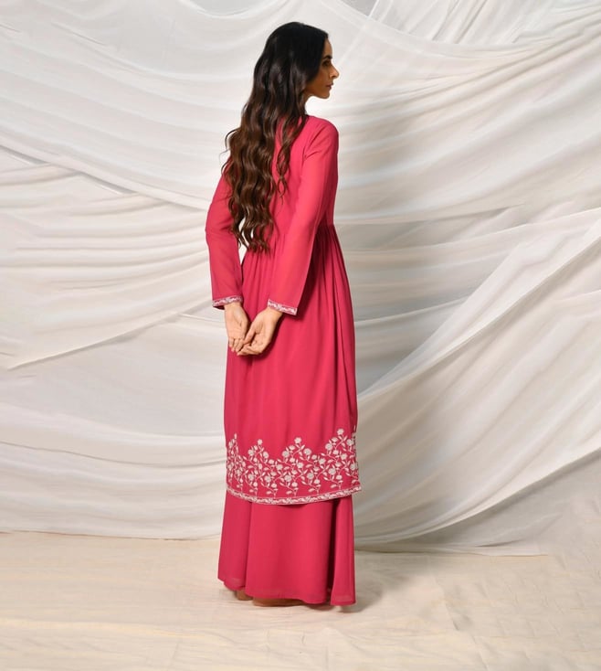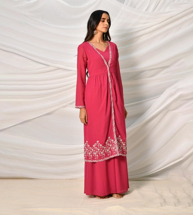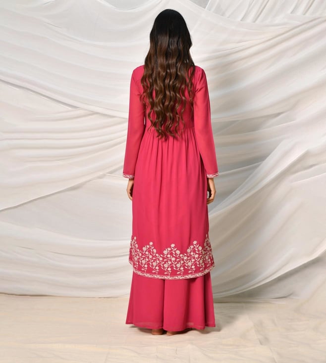 Take a fashion-forward stance by wearing this sharara set. The jacket kurta and sharara pants seem a perfect pair for your wardrobe and for you to marvellously shine in. This garment from the Adah collection has been crafted with care from georgette (100 percent polyester).