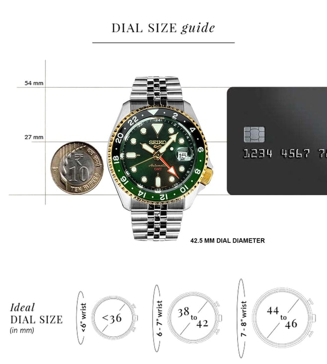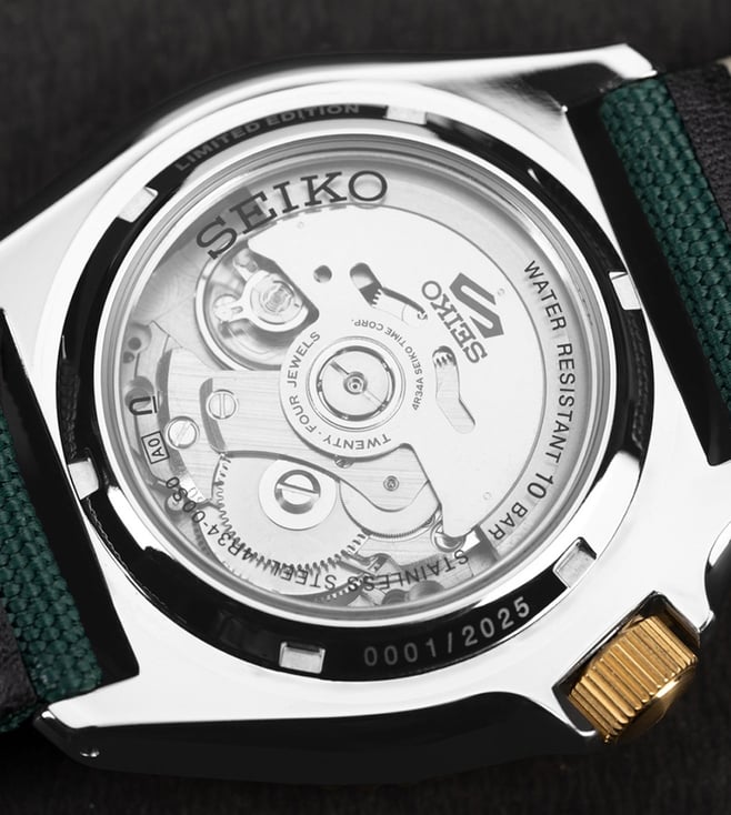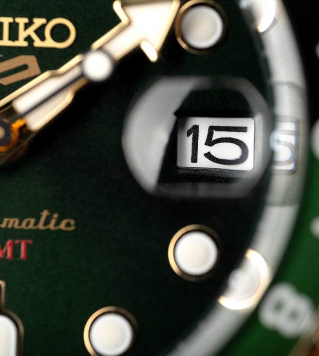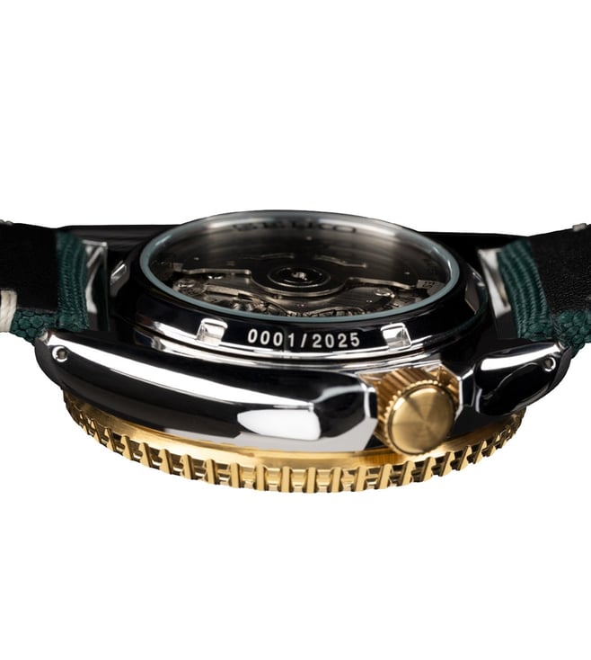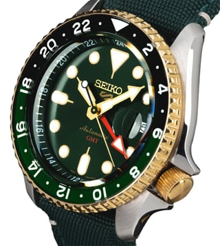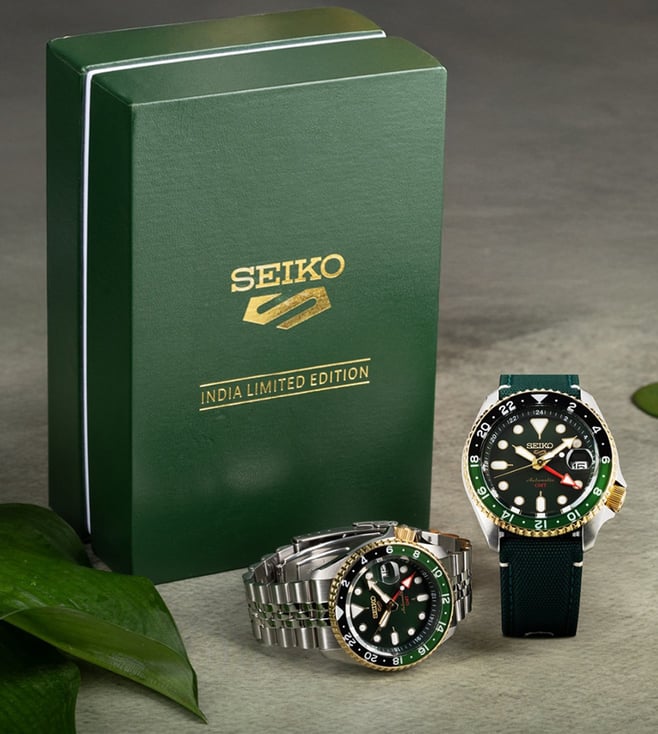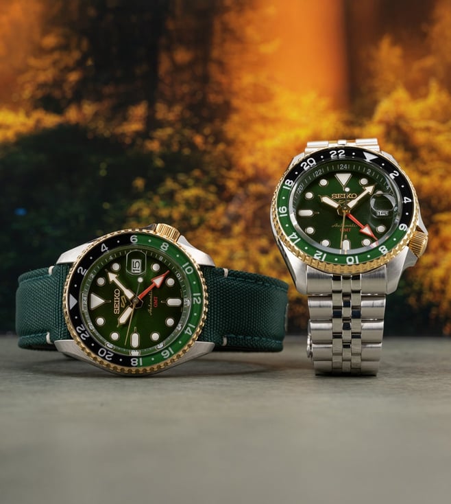 Seiko 5 Sports Forest Green Sunrise ¿ India Limited Edition (SSK050K1), Celebrate the beauty of India¿s wilderness with the Seiko 5 Sports Forest Green Sunrise ¿ India Limited Edition (SSK050K1). Inspired by the first light of dawn, this timepiece features a deep forest green dial representing the heart of the forest, while golden accents on the bezel capture the glow of sunrise breaking through the canopy. Powered by the Calibre 4R34 automatic movement, the watch includes a GMT function for tracking multiple time zones with ease.