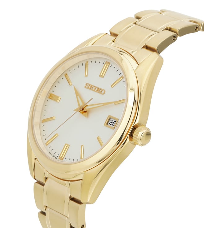 The Classique collection features timeless, smart designs with fluid lines. This all-stainless steel watch is distinguished by its gold coating. Its attractive white dial features gold hands and hour markers, as well as a date display at 3 o'clock. The hands are powered by a precise quartz calibre and are protected by scratch-proof sapphire glass crystal.