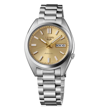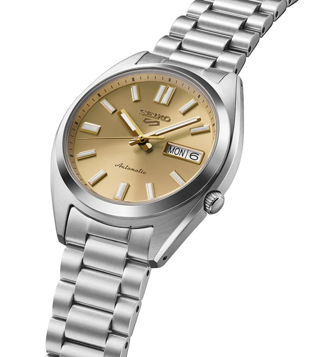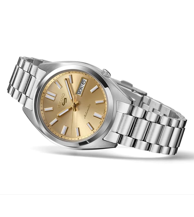 Continuing the evolution of our long-standing Seiko 5 Sports fan favourite SNXS series, this new watch adopts the design principles of the original inspiration. With the preppy dial colourway of the first SNXS watches, this modern interpretation takes the essence of 70s Seiko 5 Sports models and integrates them with modern specifications. The dial features white Lumibrite hands and indices for a crisp modern look, on a Gold Cufflinks coloured dial. The gold-coloured hands and indices are non-triangular and contrast with the coloured dial for an elegant aesthetic.