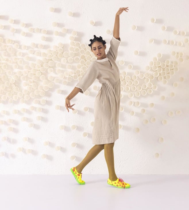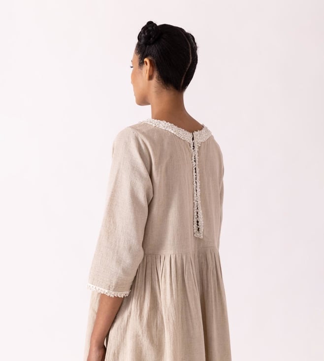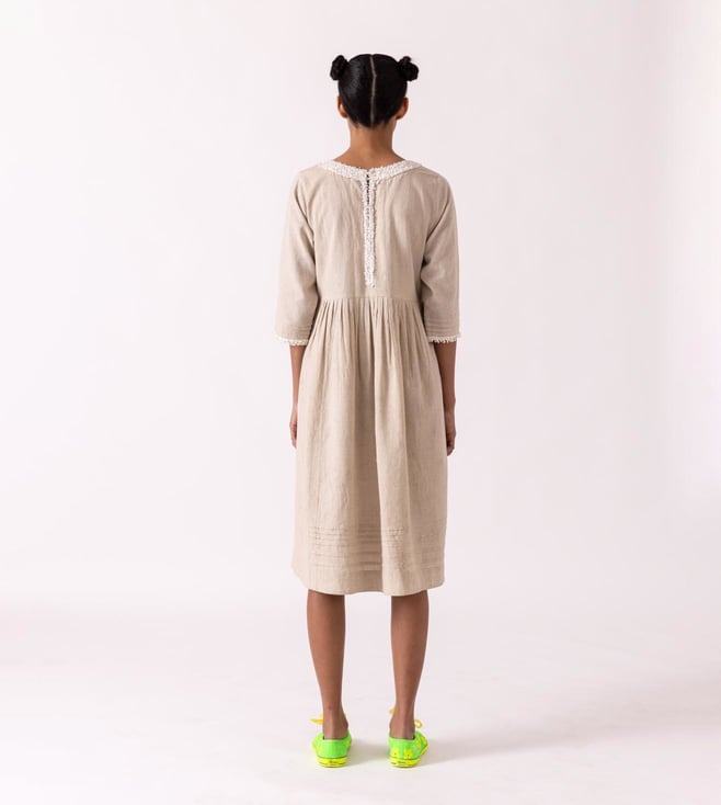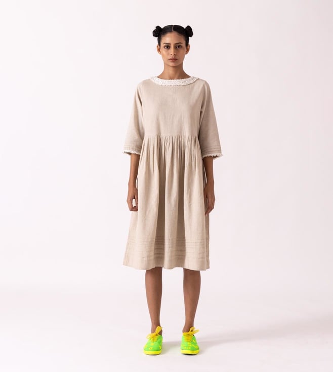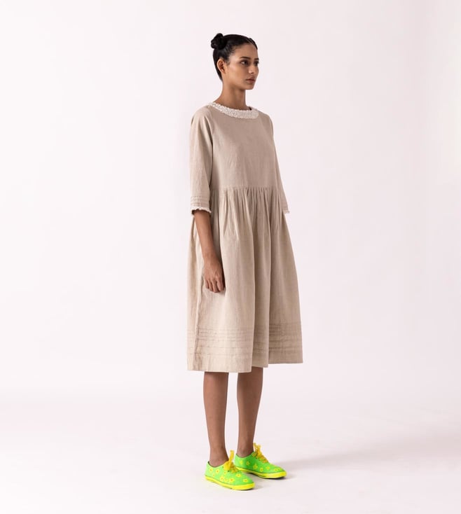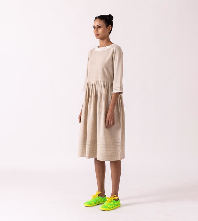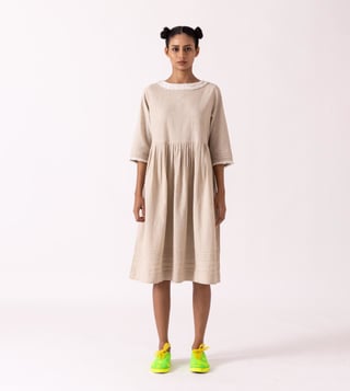 Fashionable and appealing, get hold of a refreshing look by donning this dress. This dress comes with a classic European silhouette. It is highlighted with a textured neck and hem detail in a pleated design. This garment from the Cinammon collection has been crafted with care using premium-quality cotton linen fabric.