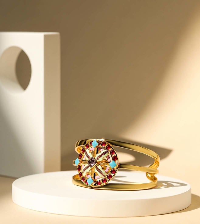 A bold design statement comes effortlessly with the Neona Blitz Multicolor Bangle from Shaze's Everywhere I Pose Collection. Crafted with Italian precision, this piece confidently showcases itself in 18K gold plating. The intricate Victorian-inspired details are enhanced by the inclusion of organically shaped water-etched pearls and fiery prismatic stones. As a modern heirloom, this bracelet features the unmistakable Shaze design signature, asserting itself as a standout piece of jewellery.