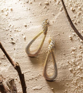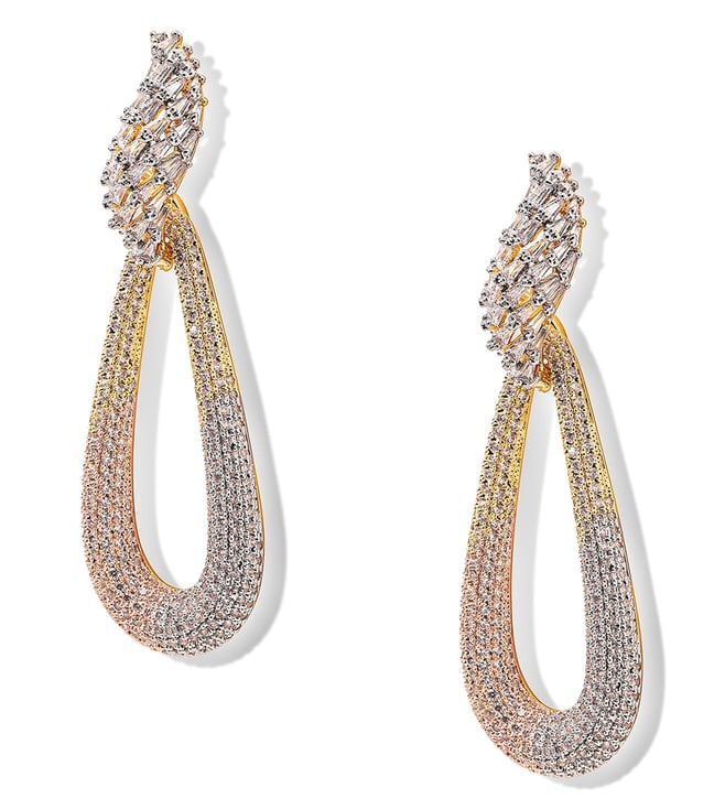 Make a statement without saying a word with this pair of earrings from Shaze. A statement accessory, it welcomes styled looks that leave an impression even after you've left a place. The folds and tri-coloured theme create its signature 'out-of-this-world' celestial whimsy. The prismatic cubic zirconia is selected for its exceptional cut and clarity creating its almost halo-like impression when worn.