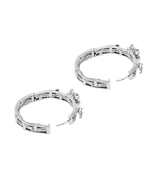 Shaze's Sundowner Secrets Collection rewrites the rules with Midsummer Meadow Silver Hoop Earrings. This design transcends the ordinary, crafting a new language in jewellery. A captivating interplay of negative space and flourishing detail, the earrings unveil an intricate pattern through their open front. The silhouette itself blossoms with a captivating bio-mimicry motif, leaving a lasting impression. Further defying convention, fiery fire-birthed stones are strategically layered, inviting you to break free from traditional jewellery pairings and embrace a bolder expression.