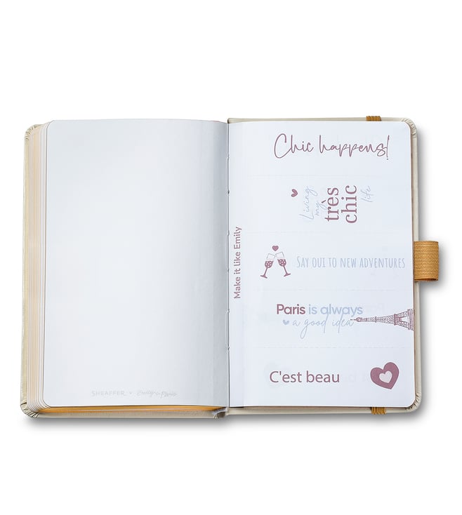 Compact, stylish and effortlessly embleming, this small hardbound notebook from Sheaffer is perfect for capturing your thoughts wherever inspiration strikes. It brings a hint of Paris to your everyday. Inside, you'll find smooth, ink-friendly 90 GSM pages ideal for journaling, sketching or note-taking. Thoughtful details like the elastic closure, integrated pen loop, and convenient storage pouch make it as practical as it is pretty. Includes an exclusive sticker sheet - personalise, highlight and add character to your pages with creative flair.