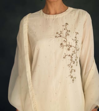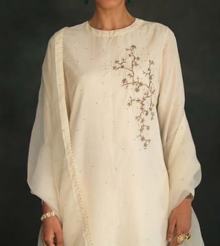 Reinvigorate your wardrobe with this ivory suit set from Shikha Mehta. The round neck adds to its appeal. Featuring three-fourth sleeves, it will surely impress your peers. It has been tailored to perfection using silk, organza and chanderi fabric that assures quality. Disclaimer: Product colour may slightly vary due to photographic lighting sources. Country Of Origin - India.