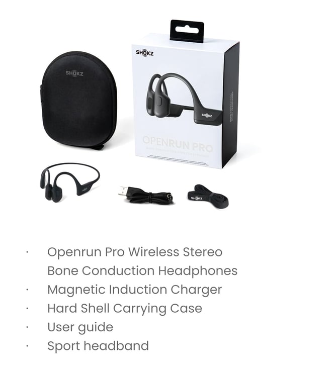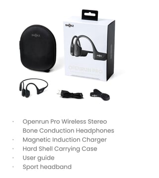 Magnetic Induction Charger, OpenRun Pro Wireless Stero Bone Conduction headphones, SHOKZ sports headband, User guide, Hard Shell Carrying Case, App instruction guide