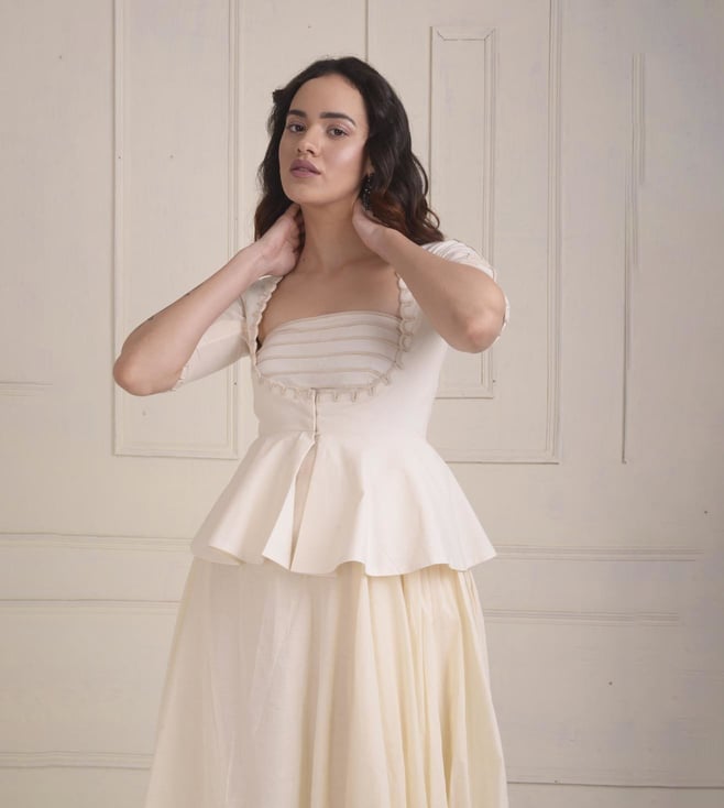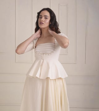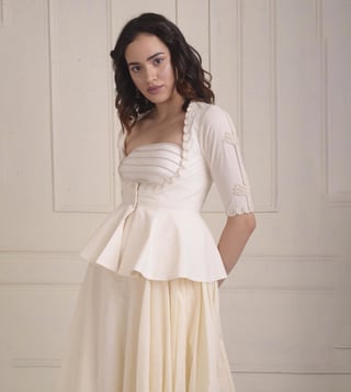 Channel a feminine style effortlessly by wearing this dress with a jacket set from the Zarra collection. This set is made of organic cotton and includes a dori embroidered peplum jacket and a draped dress. Disclaimer: Product colour may slightly vary due to photographic lighting sources. Country of Origin - India.