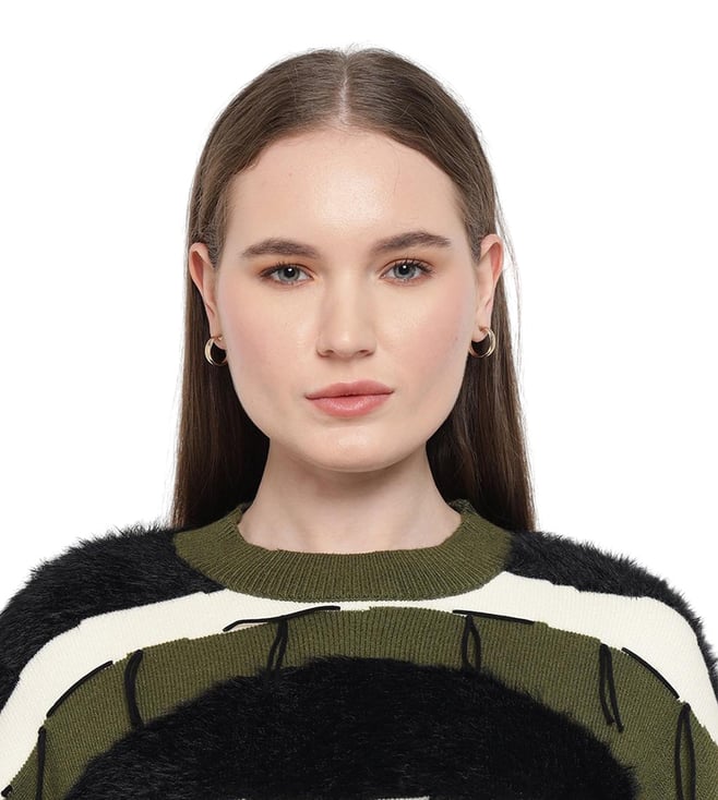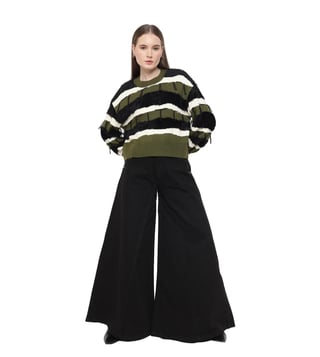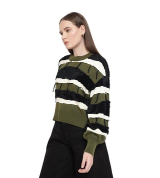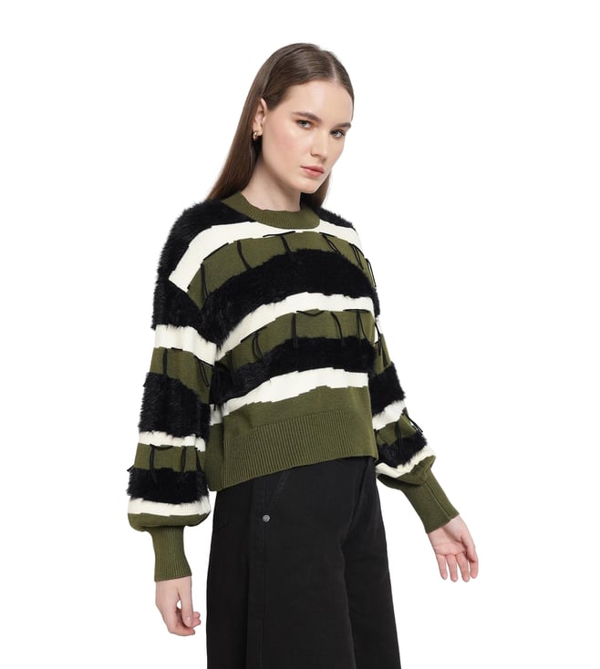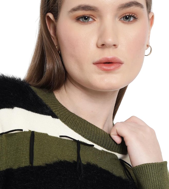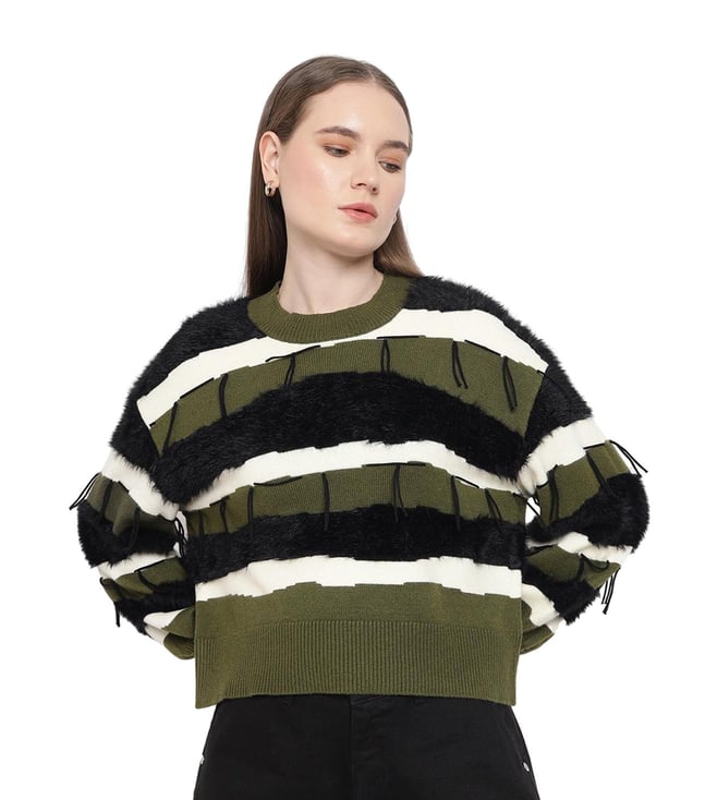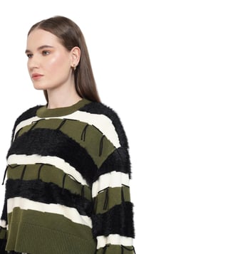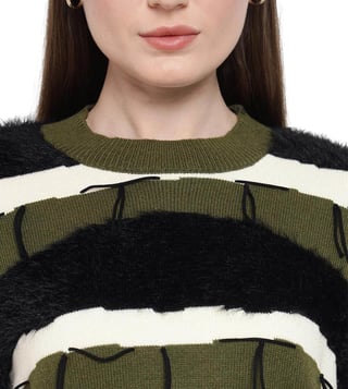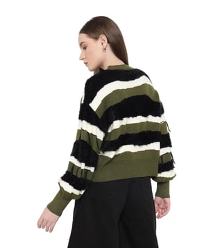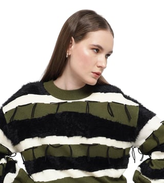 A cozy essential with thoughtful details, this stylish sweater combines style and comfort effortlessly. The sweater features a textured neck and faux fur trims for a unique touch. The color block broad stripes pattern adds a striking appeal, while fringe details provide a playful finish. Perfect for layering, it delivers both warmth and flair, making it an ideal choice for everyday wear.