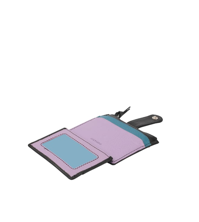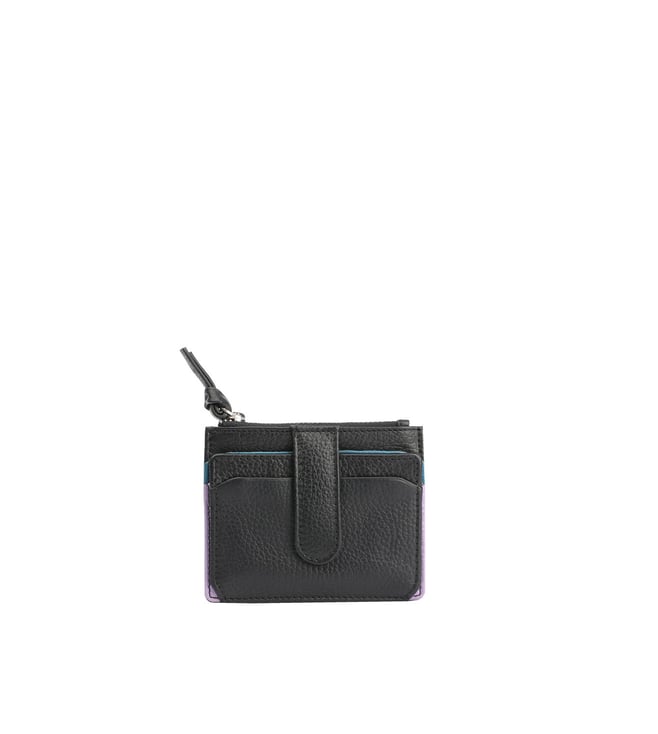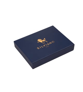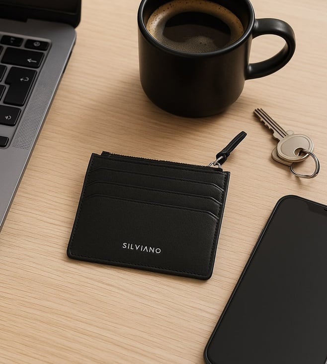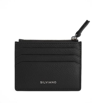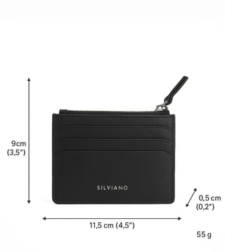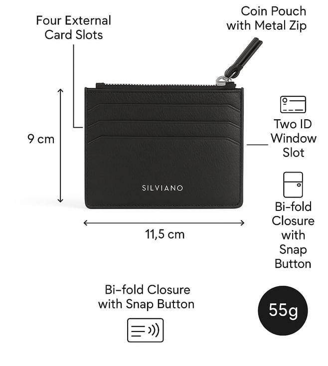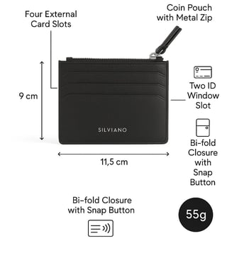 Park your cards in style in this coin and card holder from Silviano. It includes two internal card slots, one ID window slot, a coin pouch with zip closure and four external card slots. It has a bi-fold closure with a snap button. It also comes with an optional tracker card.