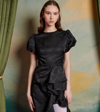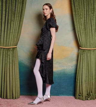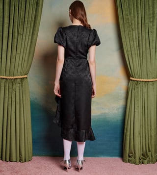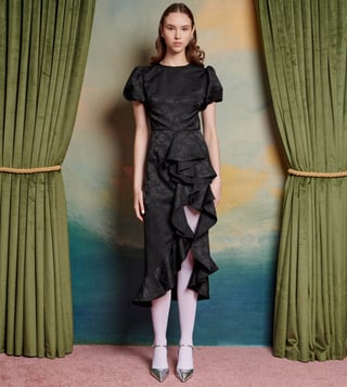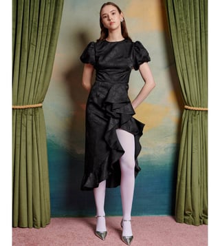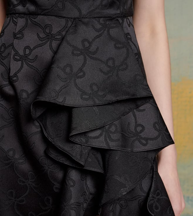 Experience classic elegance with a twist in the waterfall dress. Crafted from lightweight bow jacquard fabric, this alluring dress features a dramatic front split opening and cascading waterfall ruffles. It is the perfect blend of timeless sophistication and modern flair.