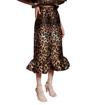 Elevate your wardrobe with the Sister Jane Brown Leopard Jacquard Printed Skirt, a stunning midi-length piece crafted from luxurious leopard jacquard fabric with metallic detailing. This high-waisted skirt features eye-catching decorative pearl and gem buttons, belt loops, welt pockets, and a charming ruffle hem for a touch of whimsy. The concealed zip closure adds a seamless finish to this chic and versatile skirt, perfect for adding a touch of sophistication to any outfit. Stand out from the crowd and exude confidence in this must-have statement piece.