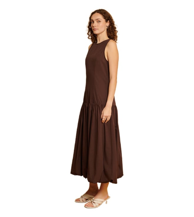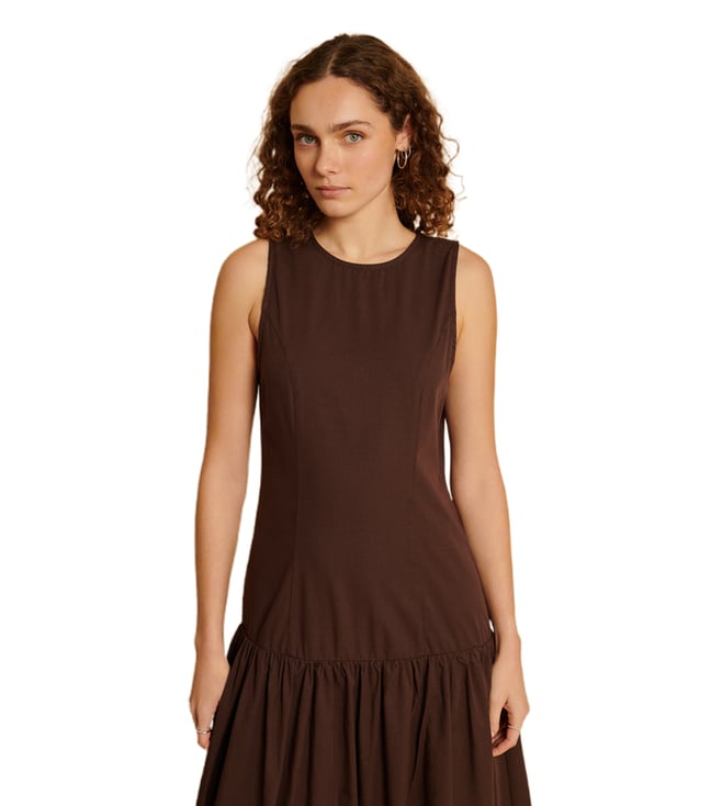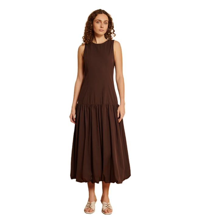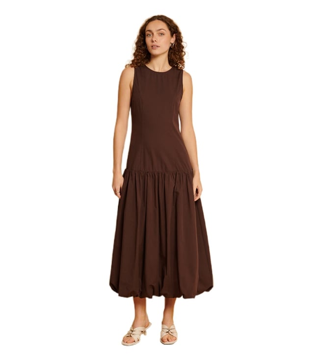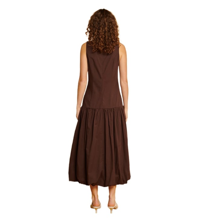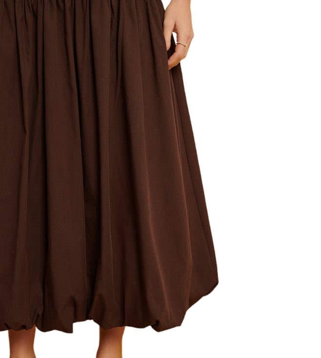 Elevate your wardrobe with the SISTER JANE Brown Solid Regular Fit Midi Dress. This versatile piece effortlessly combines style and comfort, making it perfect for any occasion. The regular fit offers a flattering silhouette, while the midi length adds a touch of sophistication. Crafted from high-quality materials, this dress is not only stylish but also durable. Whether you are heading to a brunch with friends or a night out on the town, the SISTER JANE Midi Dress is sure to turn heads and make you feel confident and chic. Upgrade your closet with this must-have staple today