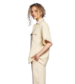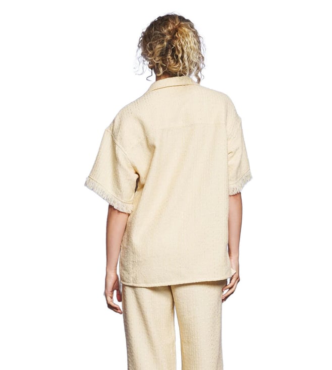 Elevate your wardrobe with the Sister Jane Yellow Printed Mountain Tweed Revere Shirt. This boho-chic boxy fit shirt is crafted from a lightweight boucle fabric, making it perfect for all-day comfort. The unique revere collar adds a touch of sophistication, while the pair of patch pockets with flaps and frayed trim at the sleeve opening add a trendy flair. Whether you are dressing it up for a night out or keeping it casual for brunch with friends, this shirt is sure to make a statement. Upgrade your style game with this versatile and stylish piece.