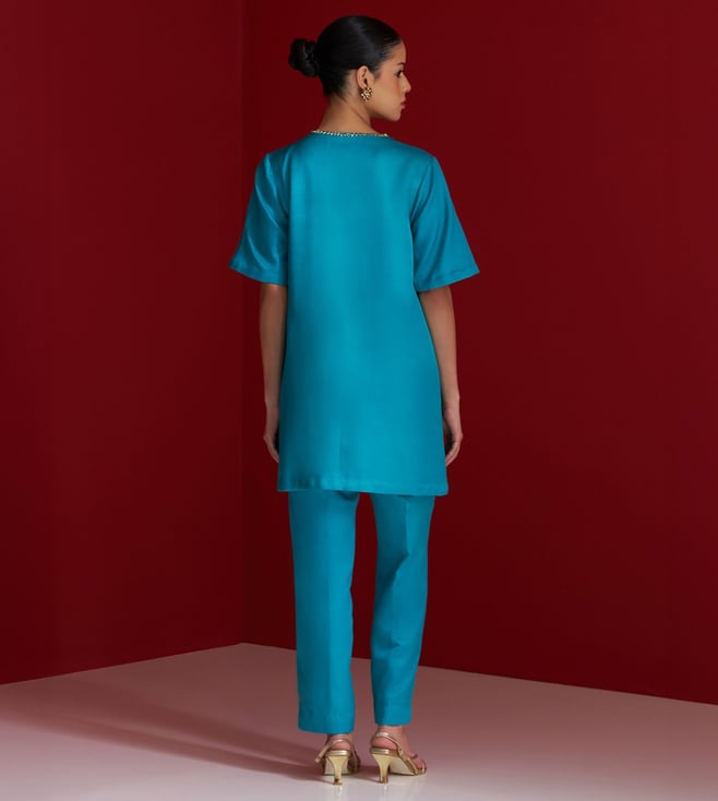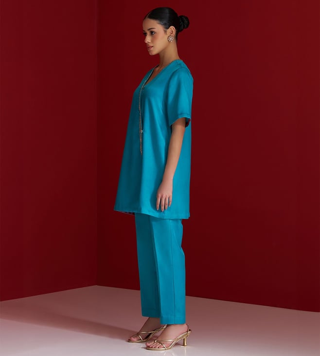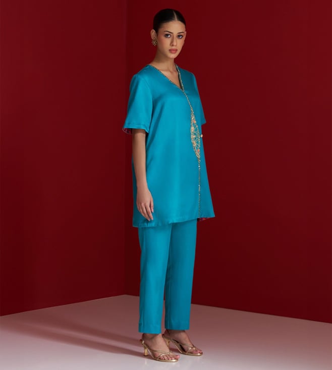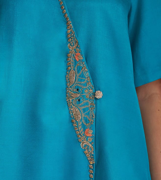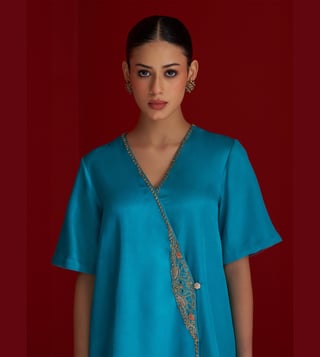 A vibrant blend of tradition and finesse, this cerulean blue kurta set features a contemporary Angrakha-style silhouette. The kurta is delicately hand-embroidered along the wrap panel using fine naqshi, sequins, and resham thread, creating a subtle shimmer with every movement. Even the handcrafted button detail adds to its artisanal charm. Paired with matching straight pants, this ensemble strikes the perfect balance between elegance and ease