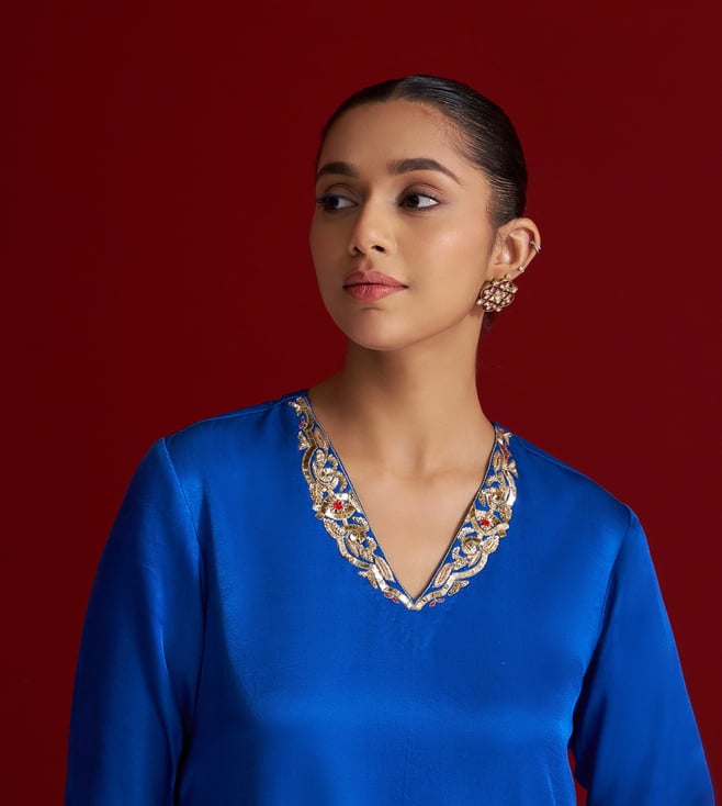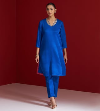 This Blue kurta set is crafted in luxurious Gajji silk. Featuring intricate zardozi and sequin embroidery along with contrasting resham work on the neckline. It is paired with matching straight pants blending traditional craftsmanship with modern elegance.