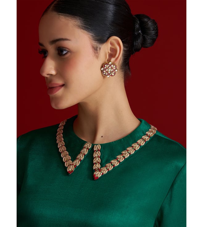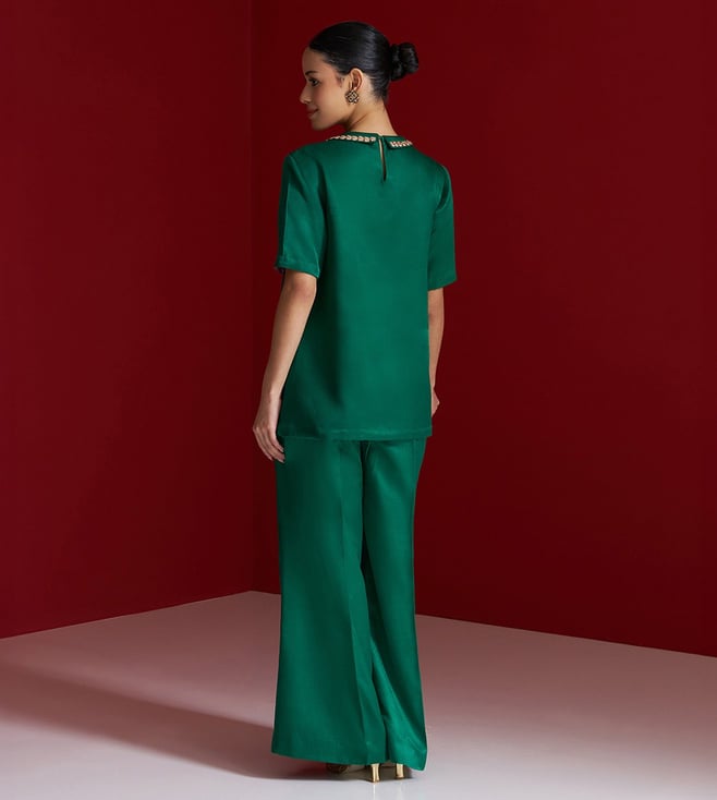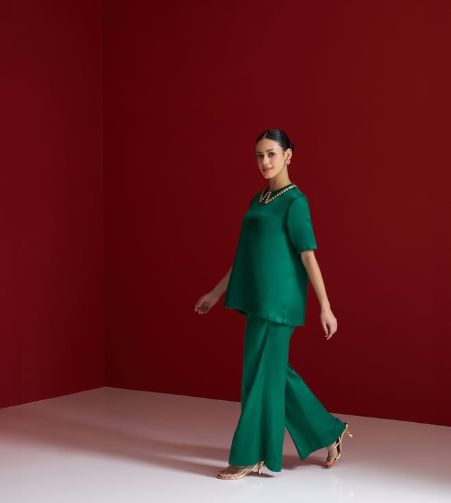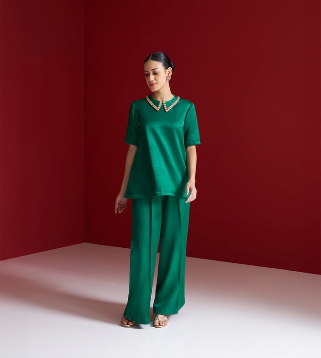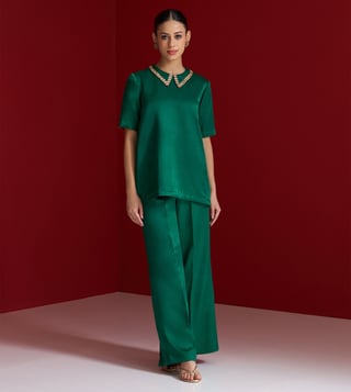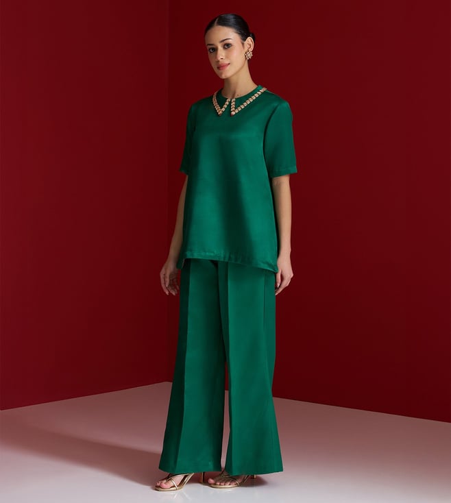Crafted in luxurious Gajji silk, this emerald green co-ord set blends minimalism with statement detailing. The top features a hand-embroidered faux Peter Pan collar, intricately adorned with dabka, sequin, and naqshi work, adding a touch of festive sparkle to the sleek silhouette. It is paired with matching flared pants.
