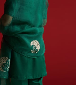 This kurta set is a celebration of heritage artistry and timeless elegance. The neckline is adorned with intricate hand embroidery featuring dabka, cutdana, resham, and naqshi work, forming a striking yali motif that depicts duality of power and grace.