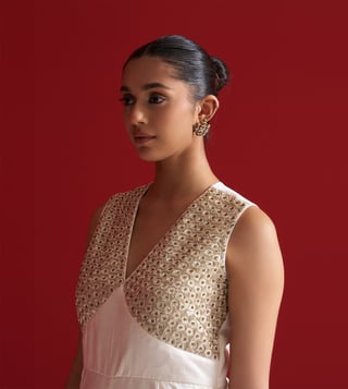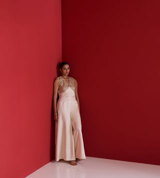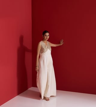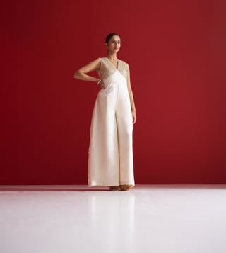Striking a perfect balance between modern elegance and traditional craftsmanship, this ivory jumpsuit is tailored in fluid Gajji silk for a luxurious drape. The sleeveless bodice features intricate hand embroidery using naqshi, green moti, and sequins, forming a delicate shimmer with a subtle contrast. Designed with a flattering V-neck and wide-leg silhouette, this piece makes for a refined statement at cocktail soir¿es, festive gatherings, or destination celebrations.