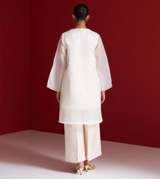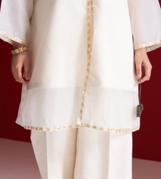A delicate blend of sheer elegance and traditional craft, this ivory ensemble features an embroidered organza overlay adorned with intricate dabka and naqshi work. It is layered over a luxurious Gajji silk inner kurta, highlighted with fine dabka and sequin embroidery along the neckline. The look is completed with matching flared pants, perfect for festive occasions or intimate celebrations.