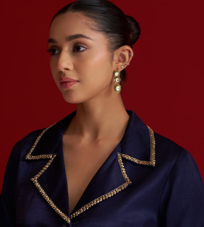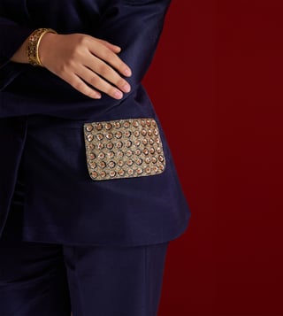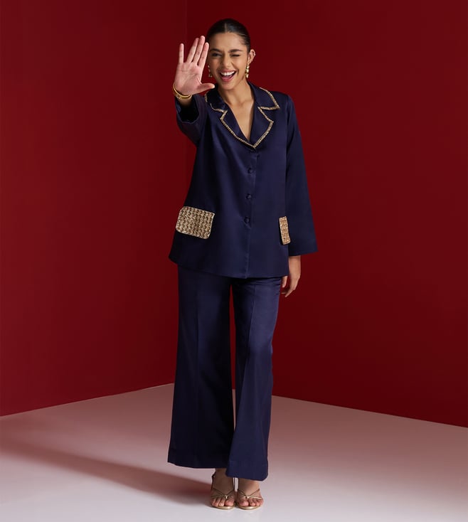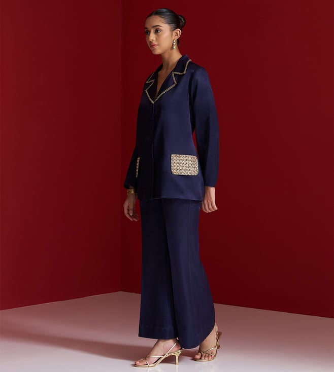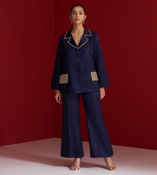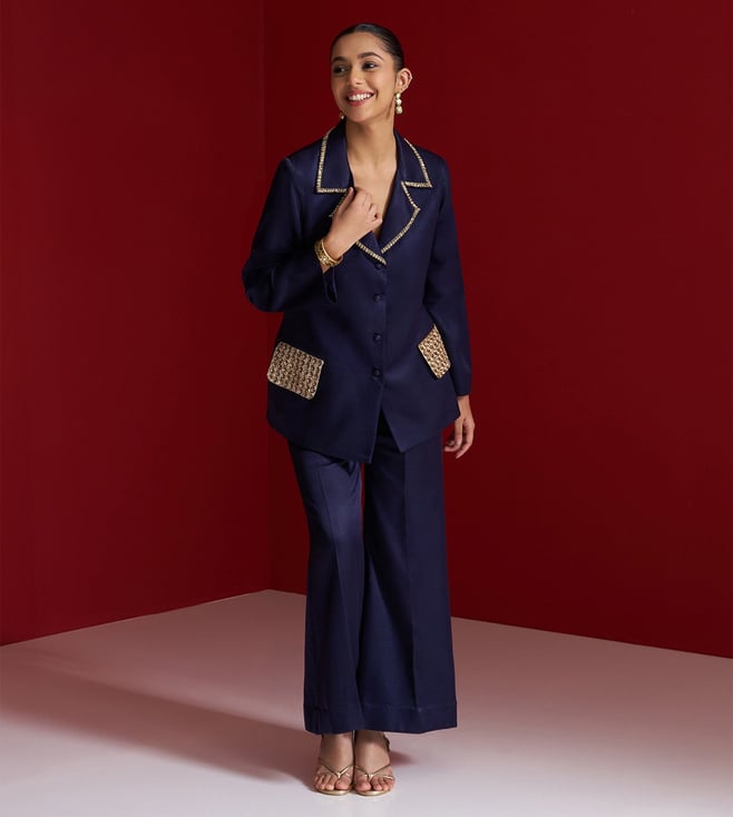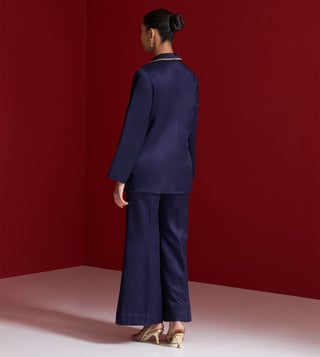 Tailored in luxurious Gajji silk, this midnight blue pantsuit set brings a striking fusion of structure and shimmer. The blazer features a sharp notched lapel collar, hand-embroidered with intricate dabka and naqshi work for a touch of opulence. Faux pocket flaps on the front are richly embellished with sequin and naqshi embroidery, adding texture and sparkle to the minimalist silhouette. Paired with flared pants in matching Gajji silk, this set is perfect for evening soirees, modern festive dressing, or statement occasionwear.
