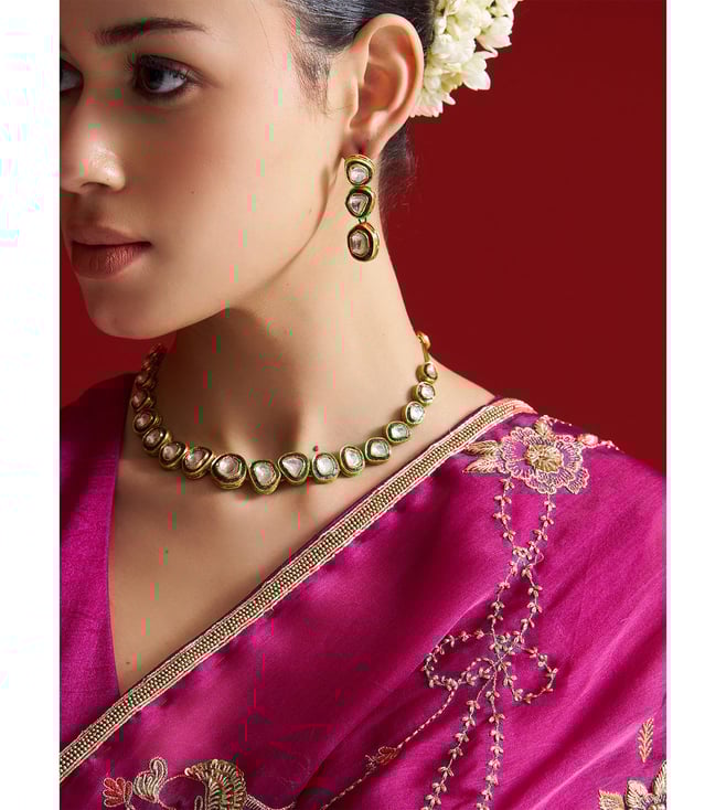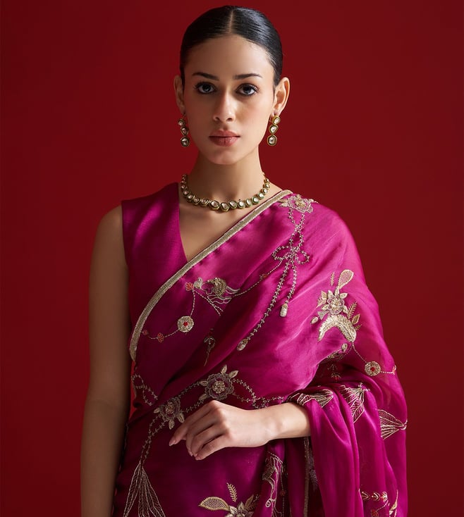Crafted in luxurious handwoven Gajji silk and Silk Organza, this fully embroidered saree is a celebration of fine craftsmanship and heritage. Adorned with intricate floral patterns and majestic Yali motifs-powerful mythical guardians symbolizing strength and courage, the embroidery is brought to life using dabka, naqshi, and resham. A flowing silk organza pallu adds lightness and movement, creating a striking contrast. It is paired with a solid blouse featuring a deep V-neck and metal zipper closure at the back.