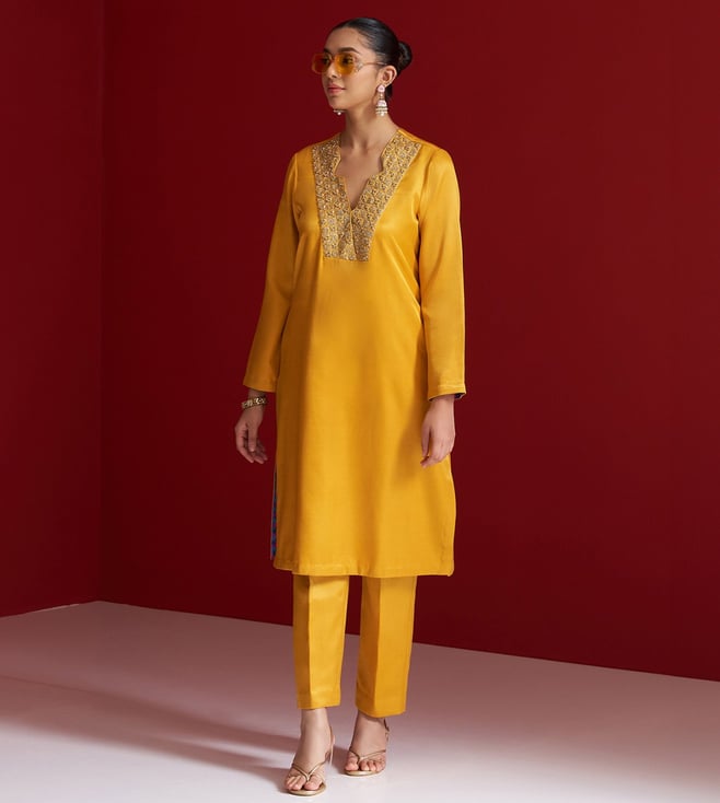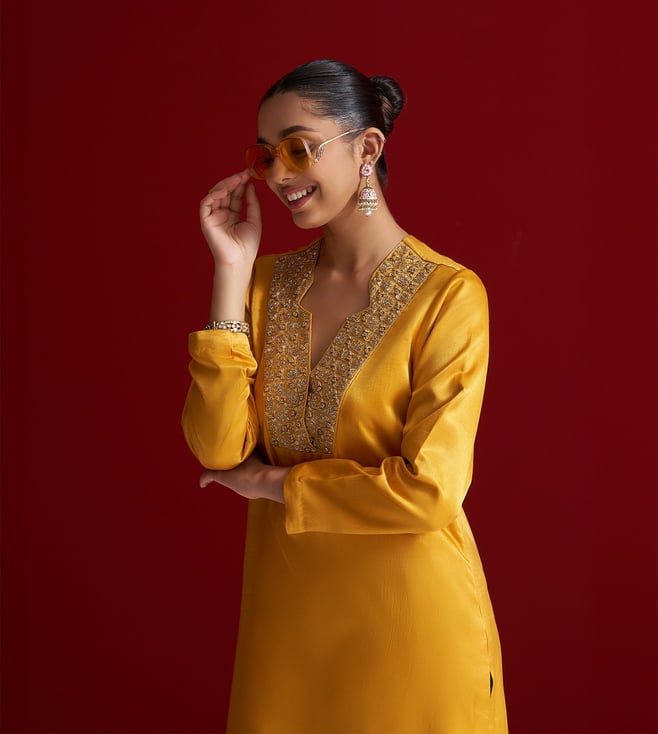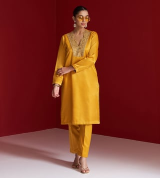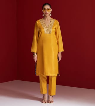 Bright and festive, this mustard kurta set adds warmth and richness to your wardrobe. The kurta features a beautifully hand-embroidered neckline adorned with dabka, naqshi, and sequins, lending a traditional yet striking appeal. Crafted in luxurious silk, the set is completed with classic straight pants-perfect for daytime festivities or elegant evening gatherings.