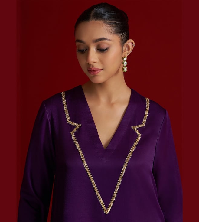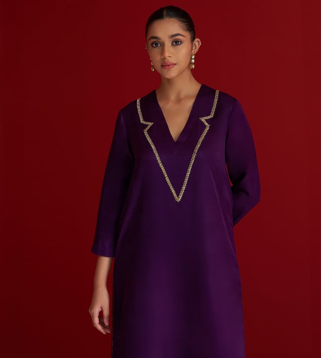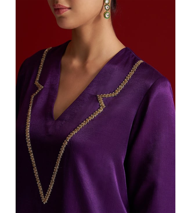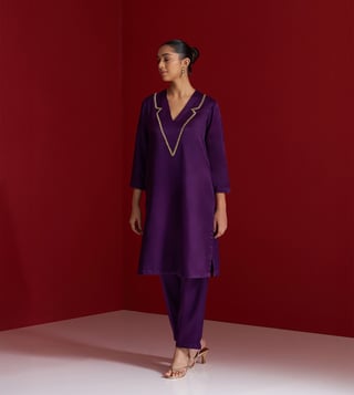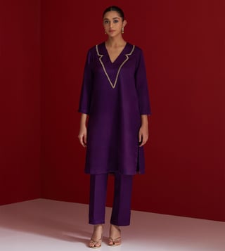Elevate your festive wardrobe with this rich purple kurta set, crafted in luxurious Gajji silk. The V-neck kurta features intricate hand embroidery on the neckline using delicate sequins and dabka work, adding a subtle shimmer and refined elegance. It is paired with matching straight pants