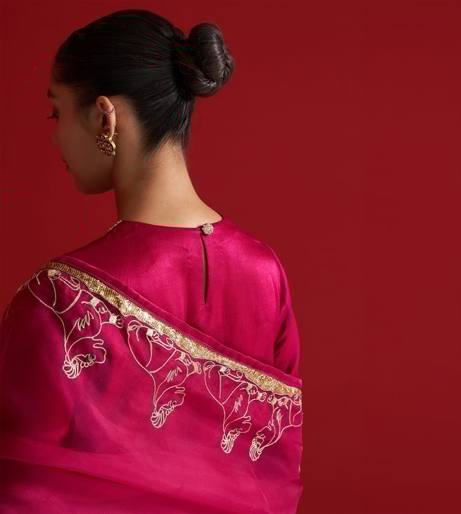 A sheer silk organza dupatta adorned with intricate hand embroidery in powerful yali motifs, crafted using zari and sequins. The detailed work runs gracefully along the borders, while the sequins add a subtle shimmer.