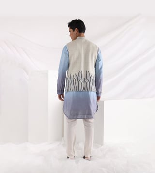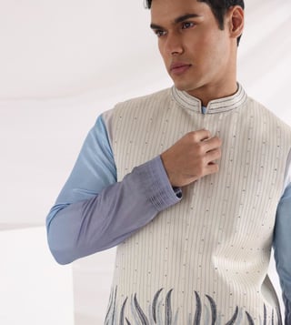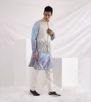 Kickstart the festivities in this Elysian abstract embroidered Nehru jacket. It is decorated with embroidery near the hemline and stitch lines that run across the whole ensemble. It has been crafted with care using linen satin. Disclaimer: Product colour may slightly vary due to photographic lighting sources. Country of Origin - India.