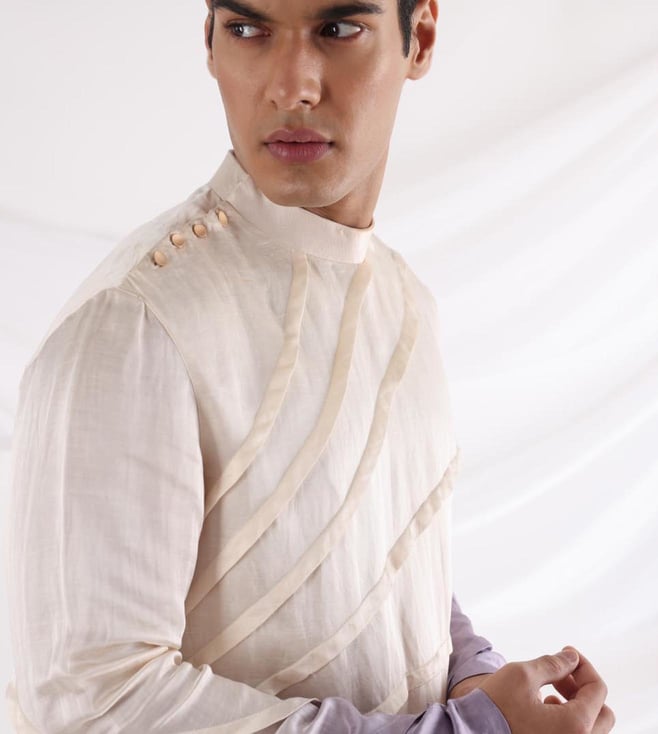 Channel a winning style by wearing this Elysian Nehru jacket and pleated kurta set. The irresistible allure of the handcrafted Nehru jacket followed by its exquisite ornamentation is all the reason you need to get decked up. A treat for fusion lovers, the kurta comes with tuck detail dawning from one end. Its ombre effect highlights the garment. The Nehru jacket has been made using linen satin. The kurta is linen satin with a soft lining. The pants are made of malai cotton. Disclaimer: Product colour may slightly vary due to photographic lighting sources. Country of Origin - India.