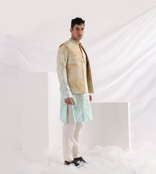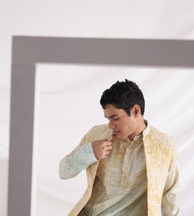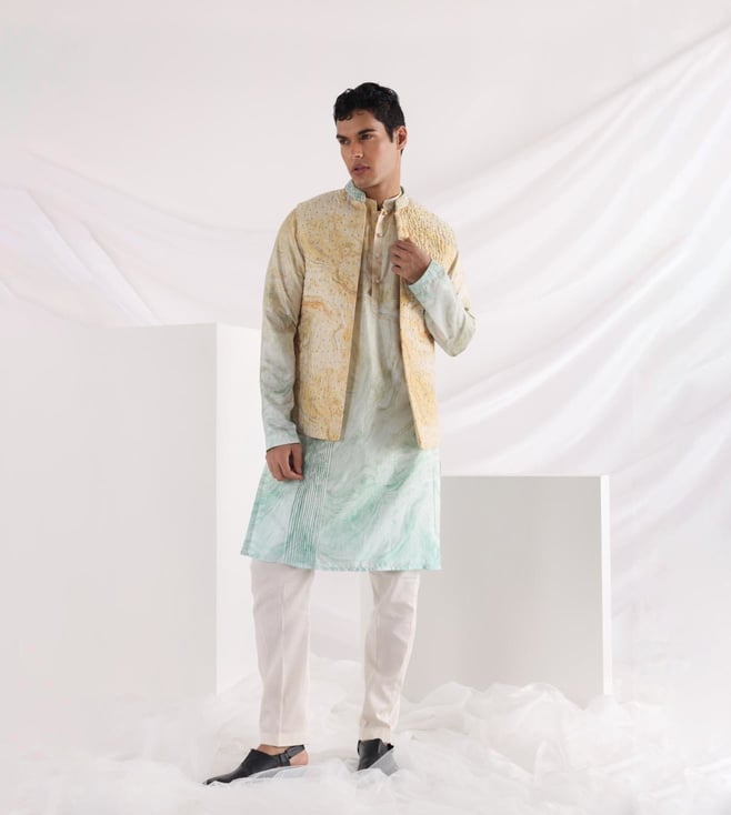 This Elysian quilted jacket in marble print is a quick pick-me-up that brings a little extra drama to your wardrobe. It has been crafted with care using flat silk. Disclaimer: All other items in the image are only for display purposes and will not be a part of the delivery content. Product colour may slightly vary due to photographic lighting sources. Country of Origin - India.