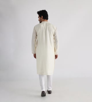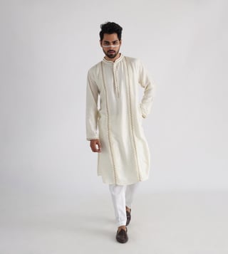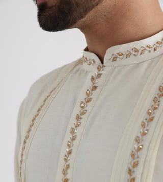 Amp up your look with this Nehru jacket and kurta set from the Guldozi collection. The Nehru jacket with embroidered motifs is inspired by the Afghani, regal elements highlighted through a masterful showcase of embroidery. The kurta is comfortable to wear for the festive season. Gold thread and sequins emphasize the kurta with pintucks. It comes with a pair of pants. The Nehru jacket is made of bam silk, the kurta is made of bam silk and mulmul and the pants are made of malai cotton. Disclaimer: Product colour may slightly vary due to photographic lighting sources. Country of Origin - India.