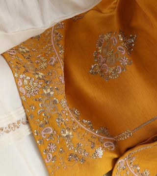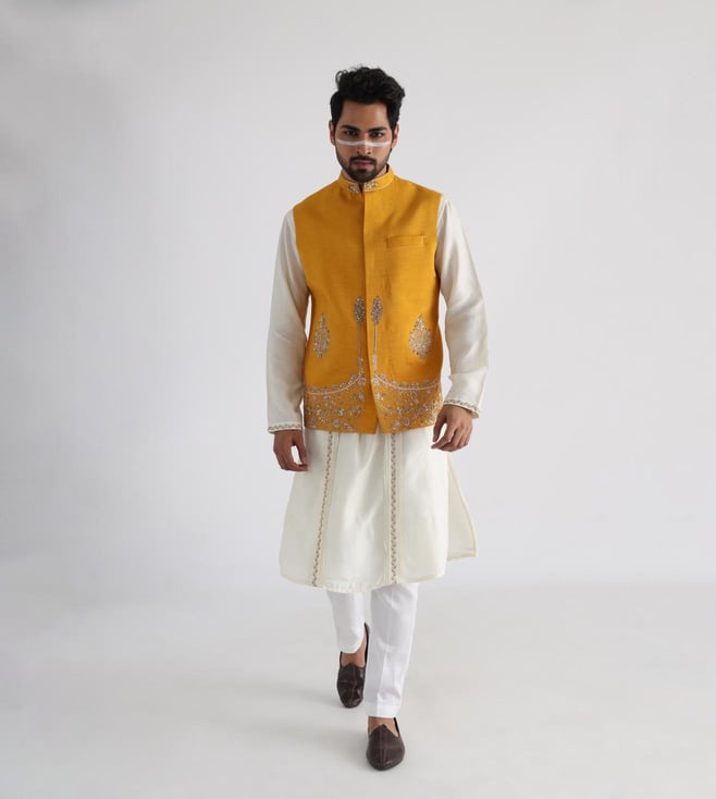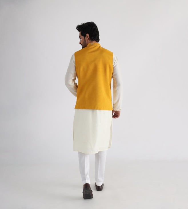 Smriti Off White, Yellow Guldozi Ruakh Yellow Embroidered Kurta with Bottom and Nehru Jacket