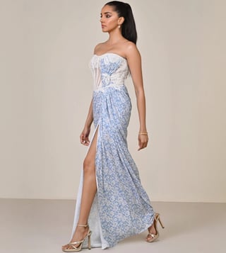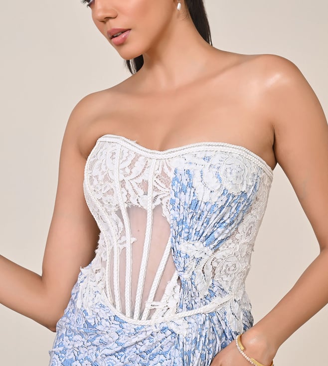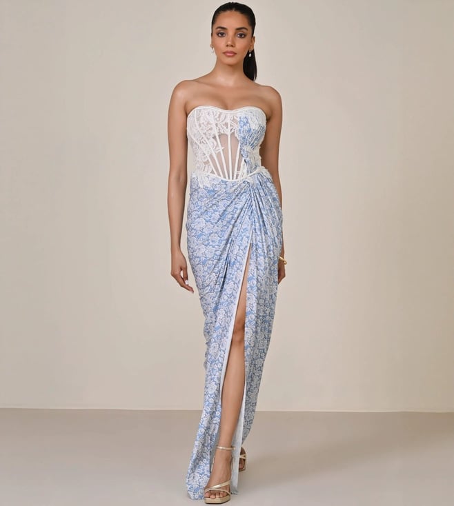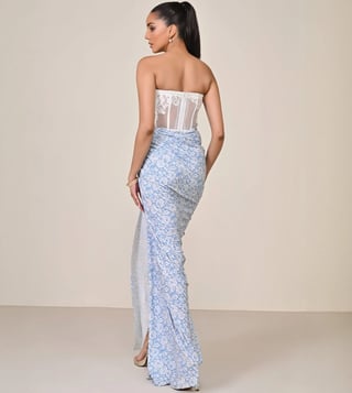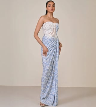 Embody contemporary elegance with the S&N Shantnu Nikhil Light Blue Applique Corset Saree Gown. This corset gown features applique detailing, a draped bottom, and a daring slit, enhancing its allure. Perfect for making a bold, fashion-forward statement at any special occasion.