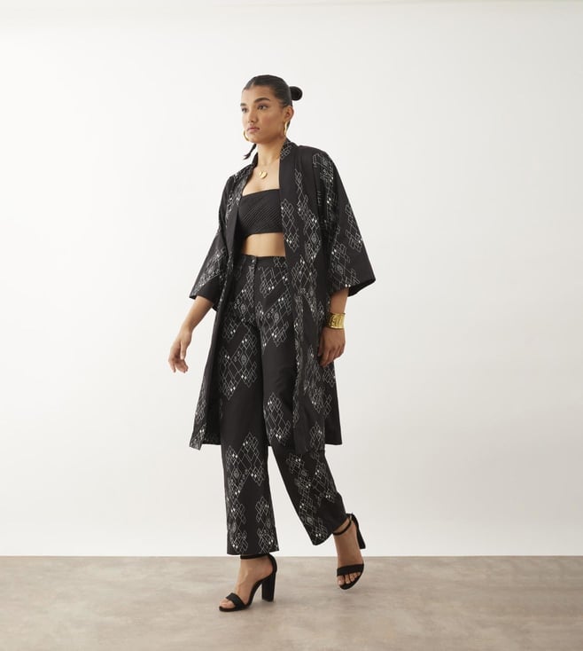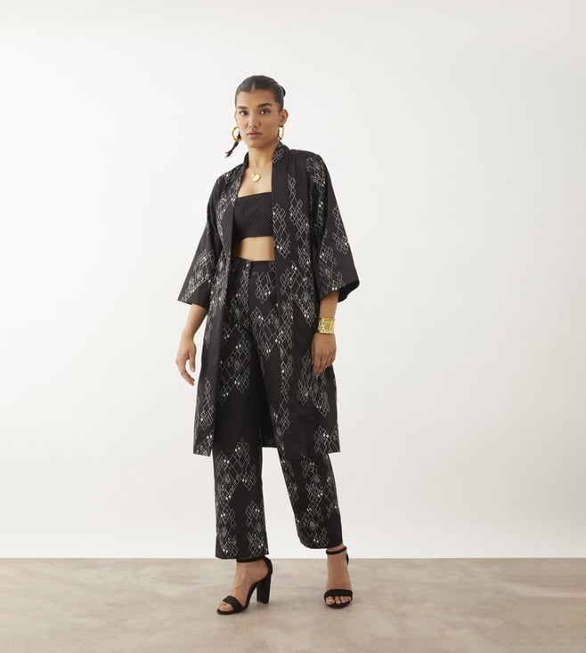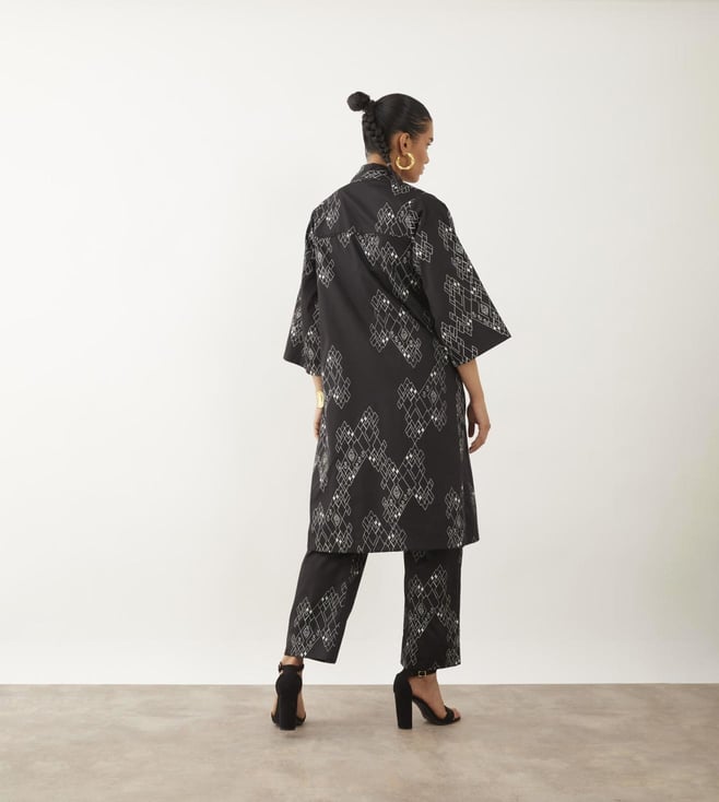 Fashionable and appealing, get hold of a refreshing look by donning this set. It is adorned with village print. This set includes a kimono-style jacket with angled welt pocket detail. It is paired with matching trousers. It has been crafted from premium quality cotton satin for a soft touch against the skin. Disclaimer: Product colour may slightly vary due to photographic lighting sources. Country of Origin - India.