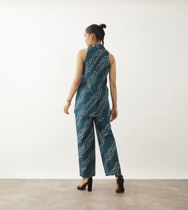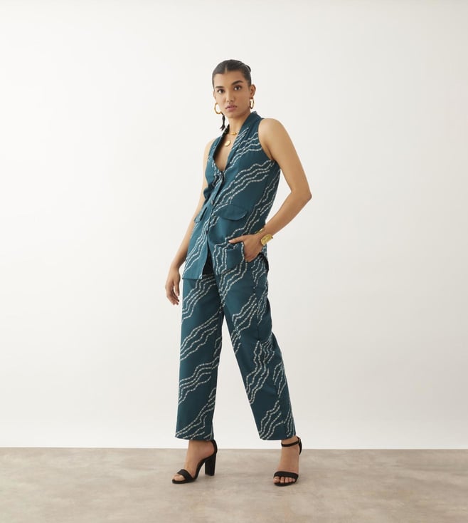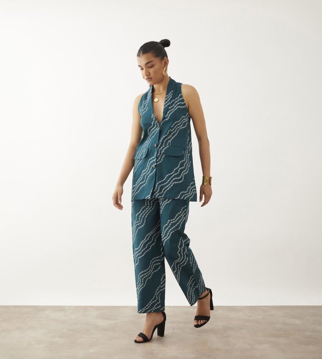 Graced with a magnetic design, this set will add a hint of style to your look. It is adorned with waves print. This vest-style jacket comes with pockets. It is paired with matching trousers. It has been crafted from premium quality cotton twill for a soft touch against the skin. Disclaimer: Product colour may slightly vary due to photographic lighting sources. Country of Origin - India.