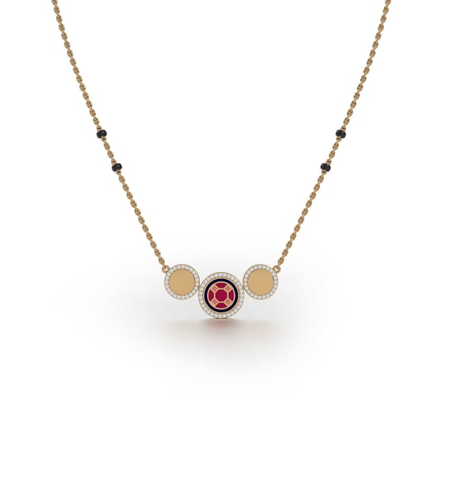 OMAIRA AURM Divine Trinity Mangalsutra Medium, from our award winning Miraas collection meticulously crafted in 18kt gold, with finely assorted diamonds, and set with Turkish octagonal honeycomb tessellation pattern in specially formulated Prussian Blue, Cardinal Red and Melon Orange enamel detailing.