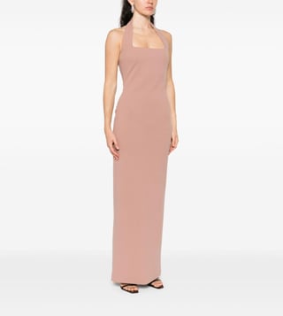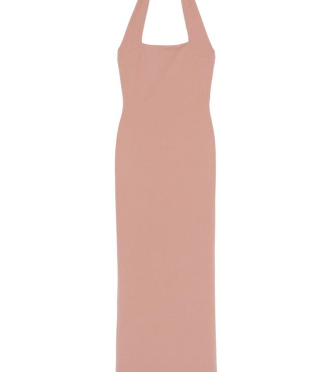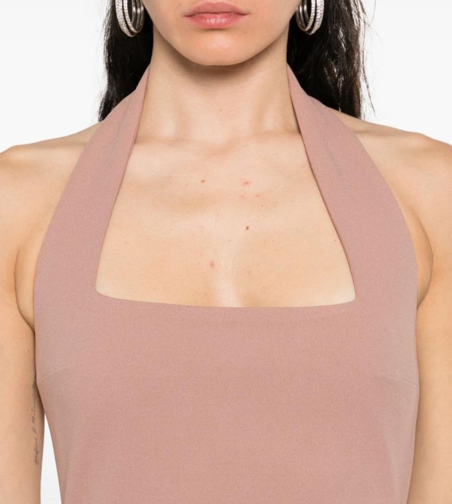 Embrace elegance with this stunning beige dress, a masterpiece of minimalist design. Crafted from a luxurious blend of 95% polyester and 5% elastane, it offers a perfect balance of comfort and stretch. The solid pattern exudes sophistication, while the sleeveless, halter neck silhouette accentuates your shoulders with grace. Designed for the modern woman, this dress is a versatile addition to any wardrobe, seamlessly transitioning from day to night with effortless style.