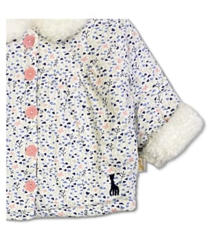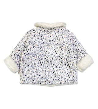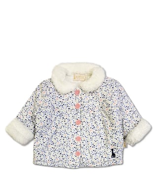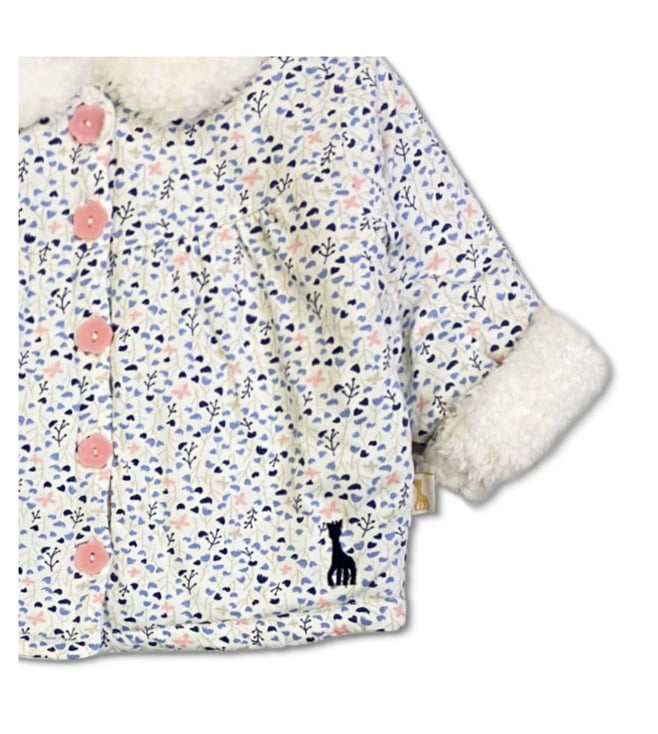 Elevate your little girls wardrobe with the Sophie La Girafe White Floral Printed Jacket. This charming and comfy jacket is the perfect addition to any outfit, featuring a delicate floral print that adds a touch of style to her outings. Whether shes playing at the park or attending a special event, this jacket will keep her looking effortlessly chic. Give her the gift of fashion and comfort with this must-have piece.