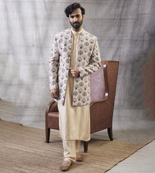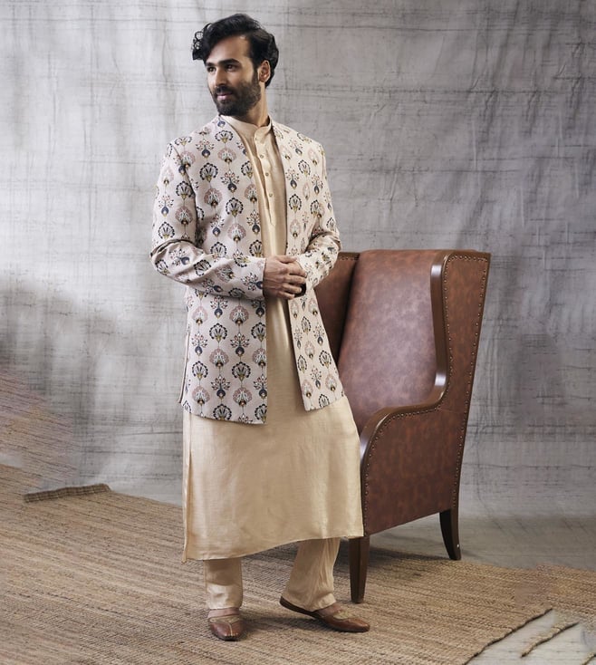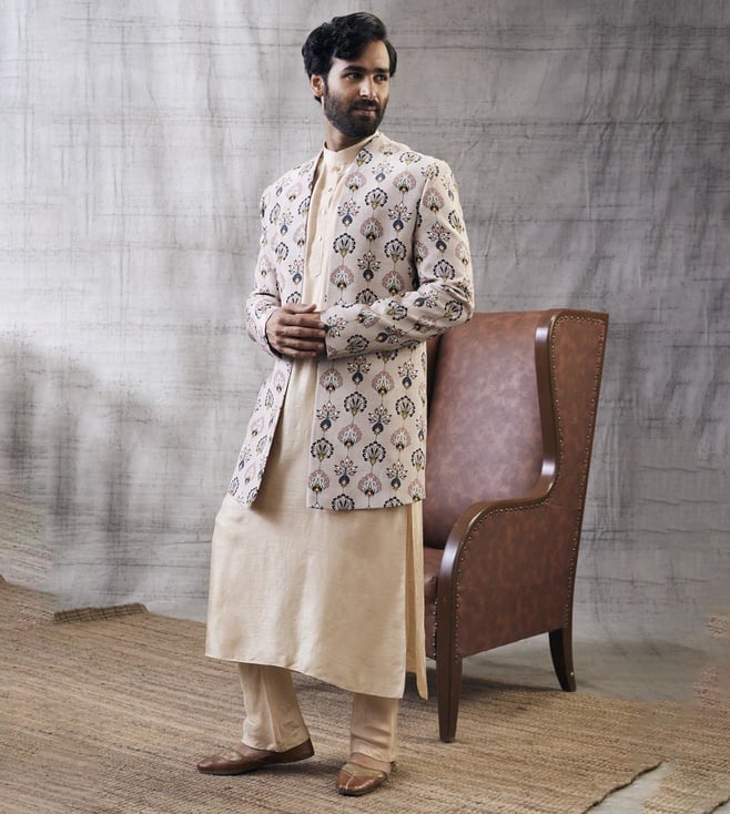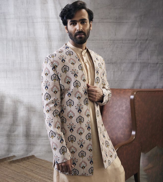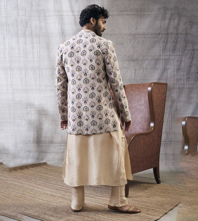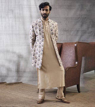 Soup By Sougat Paul Beige Sarouk Printed Longline Jacket With Kurta and Pant