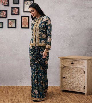 Manifesting extraordinary craftsmanship, amaze everyone by sporting this embroidered jacket with a draped skirt. It has been crafted with care from premium quality Malaysian silk and crepe which feels soft against the skin. Disclaimer: Product colour may slightly vary due to photographic lighting sources. Country of Origin - India.